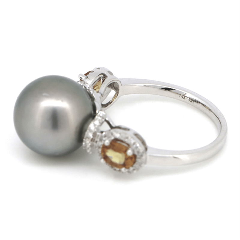 14K WHITE GOLD, GREY CULTURED TAHITIAN PEARL, ORANGE SAPPHIRE AND DIAMOND, DRESS RING.