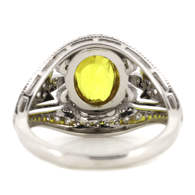 The Centre Features, One Modified Cushion Cut, Strong Yellow, Sapphire (1.96Ct, Light Natural Inclusions), Bezel Set With Filigree Detail. Decorating The Design Are, 86 Round Brilliant Cut, Diamonds (0.53Ct Tdw, H-J Colour, Si-I2 Clarity), Bead Set. Ring Size N 1/2.