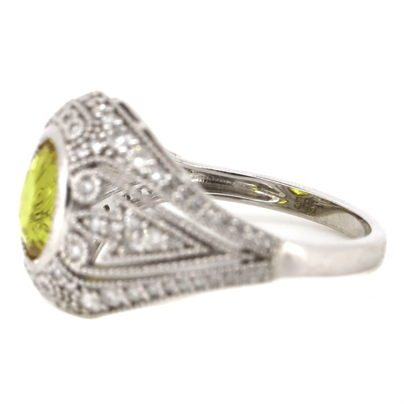 14K WHITE GOLD, YELLOW SAPPHIRE AND DIAMOND, CLUSTER RING.