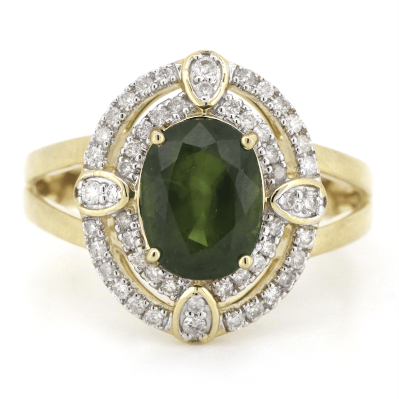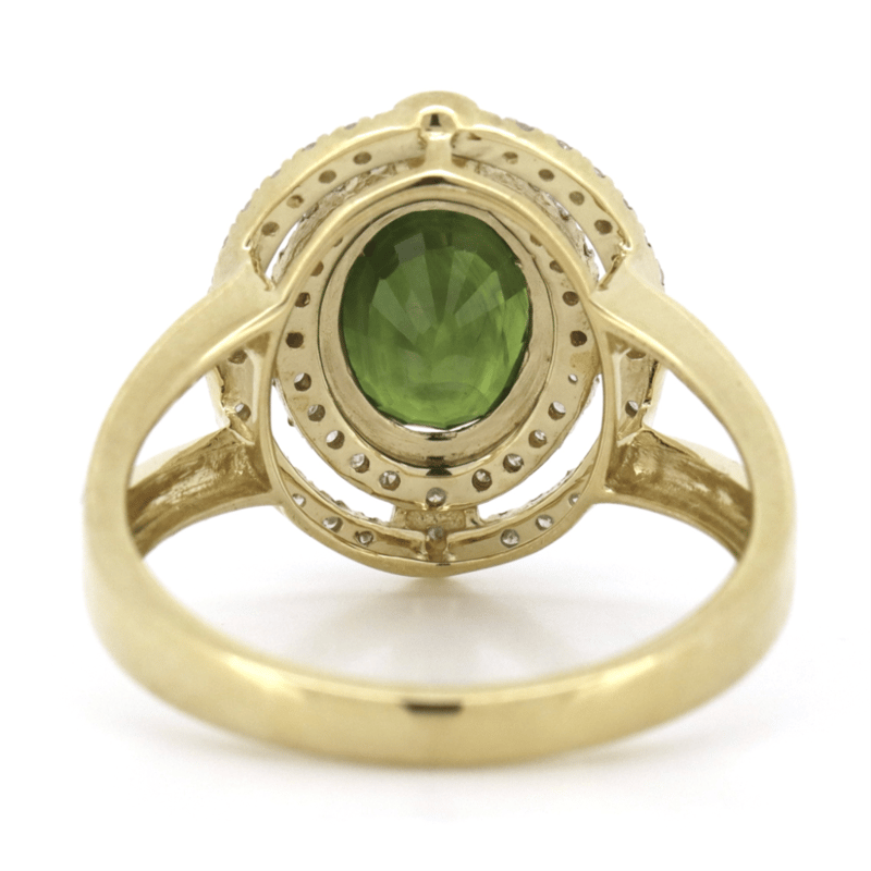 14K YELLOW GOLD, GREEN SAPPHIRE AND DIAMOND, DOUBLE HALO SPLIT BAND RING. The Centre Features, One Oval Cut, Moderate Dark Green, Sapphire (2.56Ct, Slightly Included), 4 Claw Set. Surrounding The Centre In A Double Halo Are, 52 Round Brilliant Cut, Diamonds (0.29Ct Tdw, G-H Colour, Si1-Si2 Clarity), Micro-Bead Set. Ring Size N. Valuations Provided by an Independent Third-Party Professional Not Directly Associated With Lloyds Auctions at AUD $$13,000.00This valuation has been conducted by an independent third-party professional. The valuation amount is an assessment by the issuing valuer and does not reflect the auction value of the item. Any inquiries regarding the valuation should be directed to the issuing valuer (refer to contact details on the certificate), as Lloyds Auctions has no affiliation or influence over the valuation, the valuer, or the stated amount. Condition: Good - Refer Images 0+18