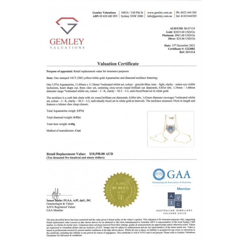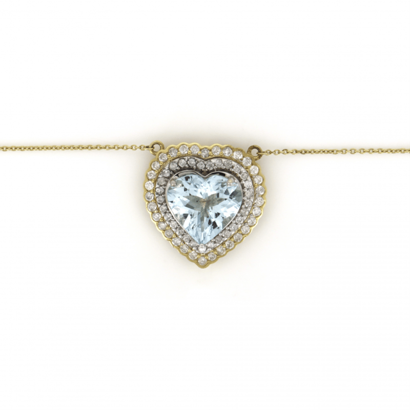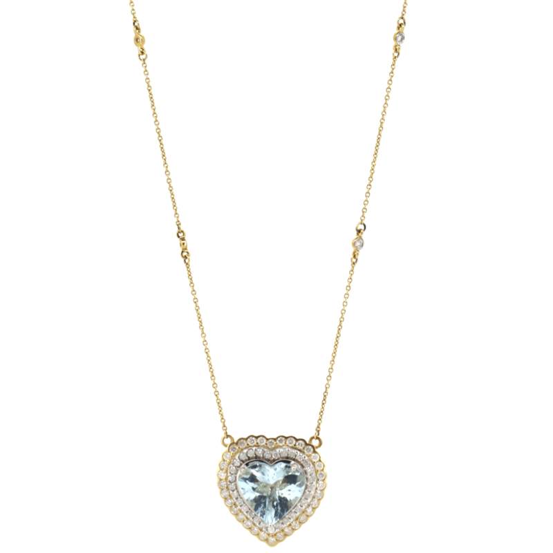 14K YELLOW/WHITE GOLD, AQUAMARINE AND DIAMOND, NECKLACE. The Pendant Features, One Heart Shape Cut, Light Greyish-Blue, Aquamarine (3.97Ct, Minor Eye Visible Inclusions), Claw Set. Surrounding The Centre In A Double Halo And Decorating The Chain Are, 73 Round Brilliant Cut, Diamonds (0.92Ct Tdw, J-K Colour, Si2-I2 Clarity), Semi-Bezel/Bead Set In White Gold. The Necklace Measures 54Cm In Length And Features A Lobster Claw Clasp Closure. Valuations Provided by an Independent Third-Party Professional Not Directly Associated With Lloyds Auctions at AUD $$10,590.00This valuation has been conducted by an independent third-party professional. The valuation amount is an assessment by the issuing valuer and does not reflect the auction value of the item. Any inquiries regarding the valuation should be directed to the issuing valuer (refer to contact details on the certificate), as Lloyds Auctions has no affiliation or influence over the valuation, the valuer, or the stated amount. Condition: Good - Refer Images 0+20