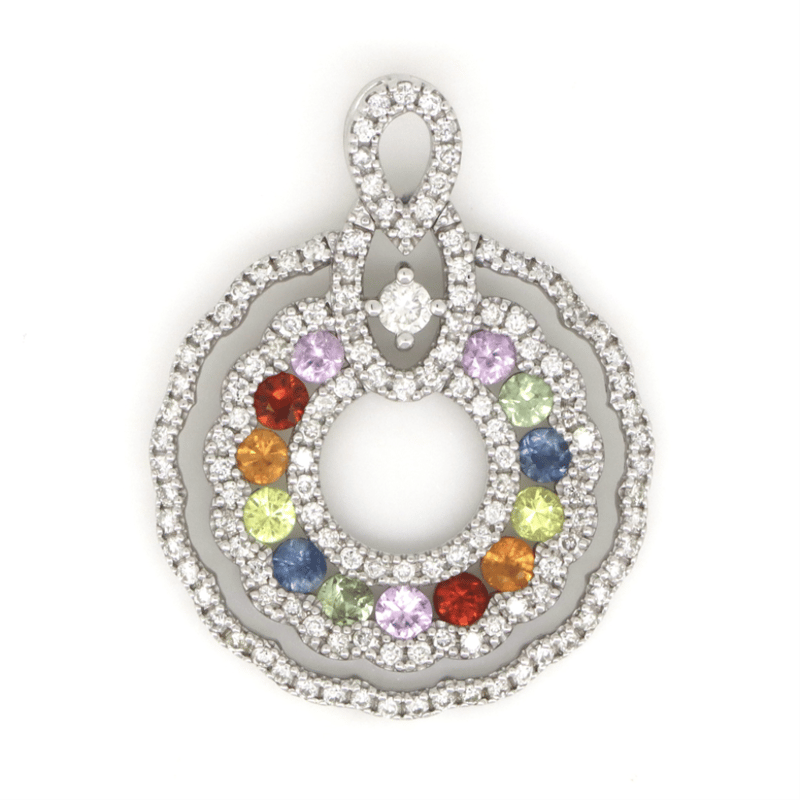 14K WHITE GOLD, MULTI-COLOURED SAPPHIRE AND DIAMOND, DECORATIVE PENDANT. The Design Features, 13 Round Faceted Cut, Pink, Green, Blue, Yellow, Orange And Red, Sapphires (0.77Ct Tsw, Eye Clean Clarity), 4 Claw Set. Surrounding The Central Design In Halos & Decorating The Pendant Are, 129 Round Brilliant Cut, Diamonds (0.57Ct Tdw, G-J Colour, Si-I2+ Clarity), Channel/Claw Set. Total Item Weight 3.1Grams. Valuations Provided by an Independent Third-Party Professional Not Directly Associated With Lloyds Auctions at AUD $$12,400.00This valuation has been conducted by an independent third-party professional. The valuation amount is an assessment by the issuing valuer and does not reflect the auction value of the item. Any inquiries regarding the valuation should be directed to the issuing valuer (refer to contact details on the certificate), as Lloyds Auctions has no affiliation or influence over the valuation, the valuer, or the stated amount. Condition: Good - Refer Images 0+32