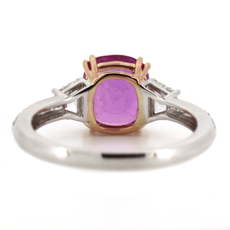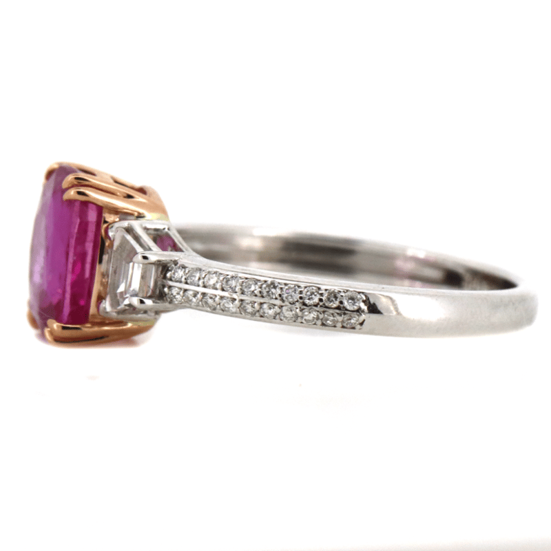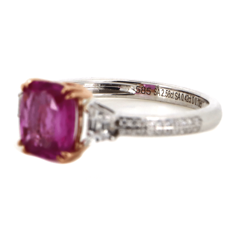 14K WHITE GOLD, PINK SAPPHIRE, WHITE SAPPHIRE AND DIAMOND, DRESS RING. The Centre Features, One Cushion Cut, Pink Sapphire (2.58Ct, Light Natural Inclusions), Claw Set. Flanking The Centre Are, 2 Trapezoid Cut, White Sapphires (0.42Ct Tsw, Eye Clean), Claw Set. Decorating The Band Are, 40 Round Brilliant Cut, Diamond (0.13Ct Tdw, H-J Colour, Si-I2 Clarity), Bead Set. Ring Size N. Valuations Provided by an Independent Third-Party Professional Not Directly Associated With Lloyds Auctions at AUD $$20,200.00 This valuation has been conducted by an independent third-party professional. The valuation amount is an assessment by the issuing valuer and does not reflect the auction value of the item. Any inquiries regarding the valuation should be directed to the issuing valuer (refer to contact details on the certificate), as Lloyds Auctions has no affiliation or influence over the valuation, the valuer, or the stated amount. Condition: Good - Refer Images 0 +36