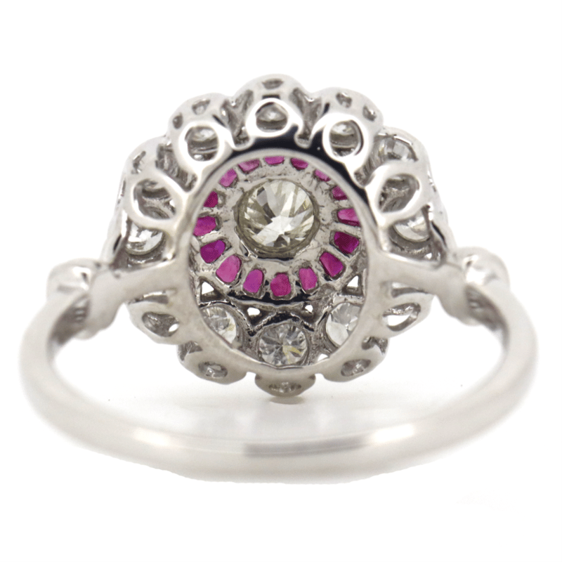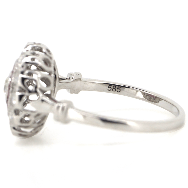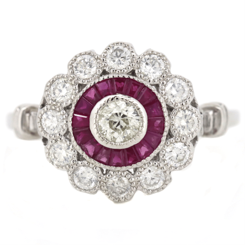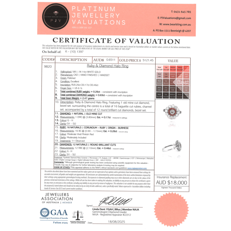 14K WHITE GOLD, DIAMOND AND RUBY, HALO RING. The Centre Features, One Round Brilliant Cut, Diamond (0.17Ct, G-H Colour, Si1-Si2 Clarity), Bezel Set. Surrounded By, 16 Baguette Cut, Rubies (0.26Ct Tsw, Moderately Included), Channel Set. Accompanied By, 12 Round Brilliant Cut, Diamonds (0.46Ct Tdw, G-H Colour, Si1-Si2 Clarity), Bezel Set. Ring Size M 1/2. Valuations Provided by an Independent Third-Party Professional Not Directly Associated With Lloyds Auctions at AUD $$18,000.00This valuation has been conducted by an independent third-party professional. The valuation amount is an assessment by the issuing valuer and does not reflect the auction value of the item. Any inquiries regarding the valuation should be directed to the issuing valuer (refer to contact details on the certificate), as Lloyds Auctions has no affiliation or influence over the valuation, the valuer, or the stated amount. Condition: Good - Refer Images 0+37