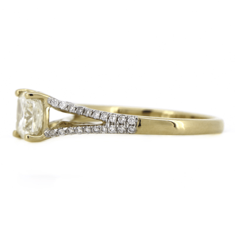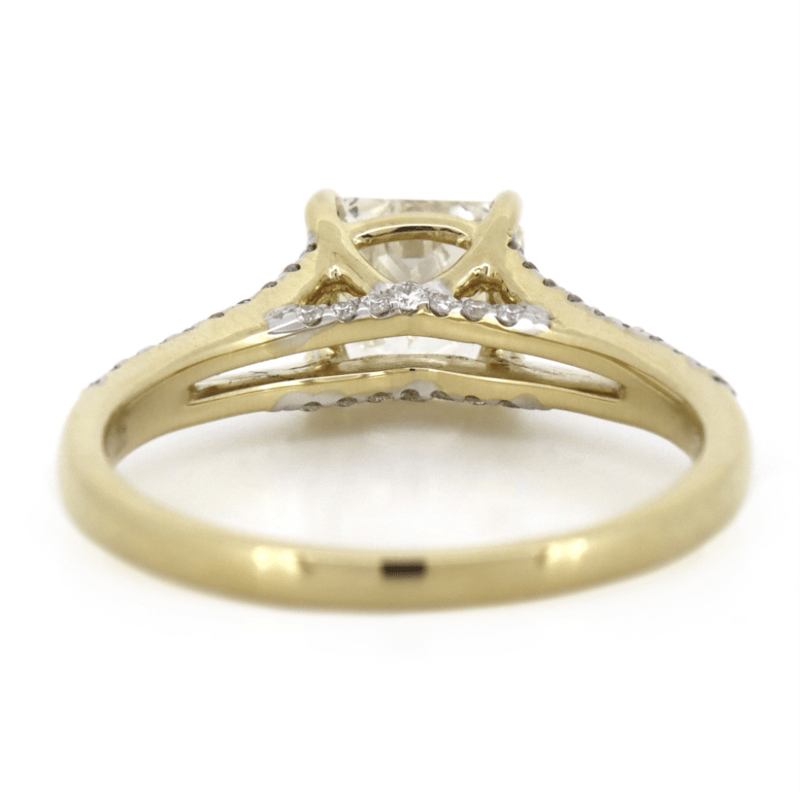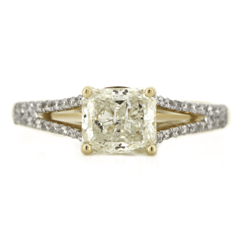 14K YELLOW GOLD AND DIAMOND, CLASSIC SPLIT BAND RING. The Centre Features, One Emerald Radiant Cut, Diamond (1.17Ct, H-I Colour, I1 Clarity), 4 Claw Set. Decorating The Split Band And Under Rail And Are, 54 Round Brilliant Cut, Diamonds (0.22Ct Tdw, G-H Colour, Si-I1 Clarity), Claw Set. Ring Size M. Valuations Provided by an Independent Third-Party Professional Not Directly Associated With Lloyds Auctions at AUD $$18,800.00This valuation has been conducted by an independent third-party professional. The valuation amount is an assessment by the issuing valuer and does not reflect the auction value of the item. Any inquiries regarding the valuation should be directed to the issuing valuer (refer to contact details on the certificate), as Lloyds Auctions has no affiliation or influence over the valuation, the valuer, or the stated amount. Condition: Good - Refer Images 0+40