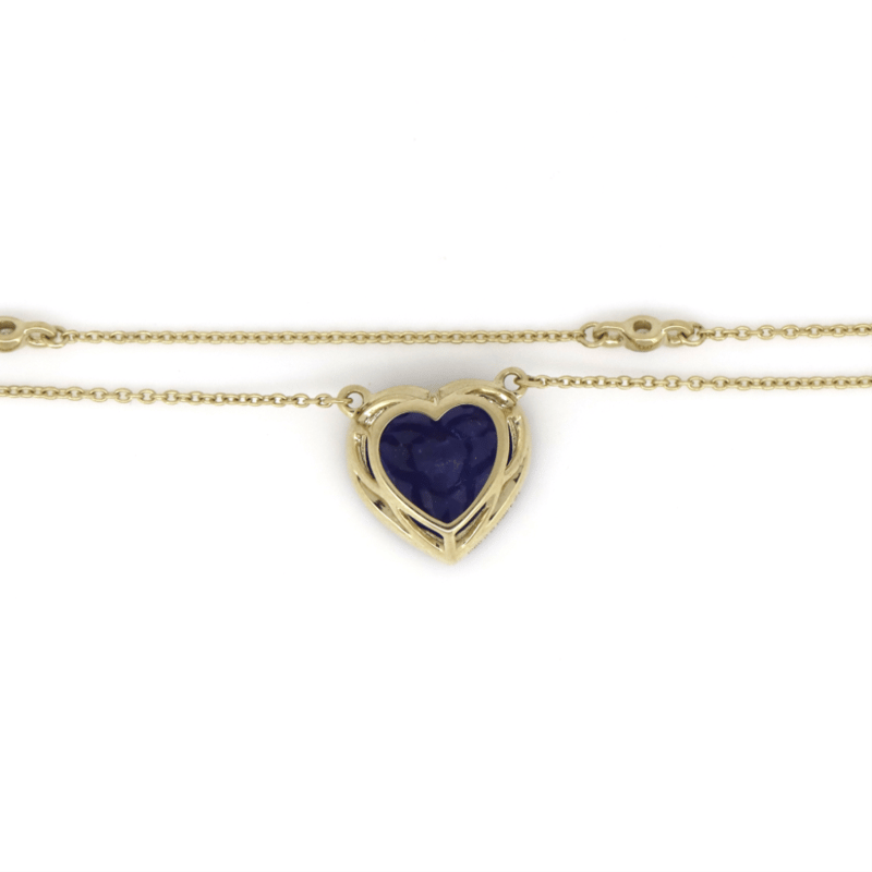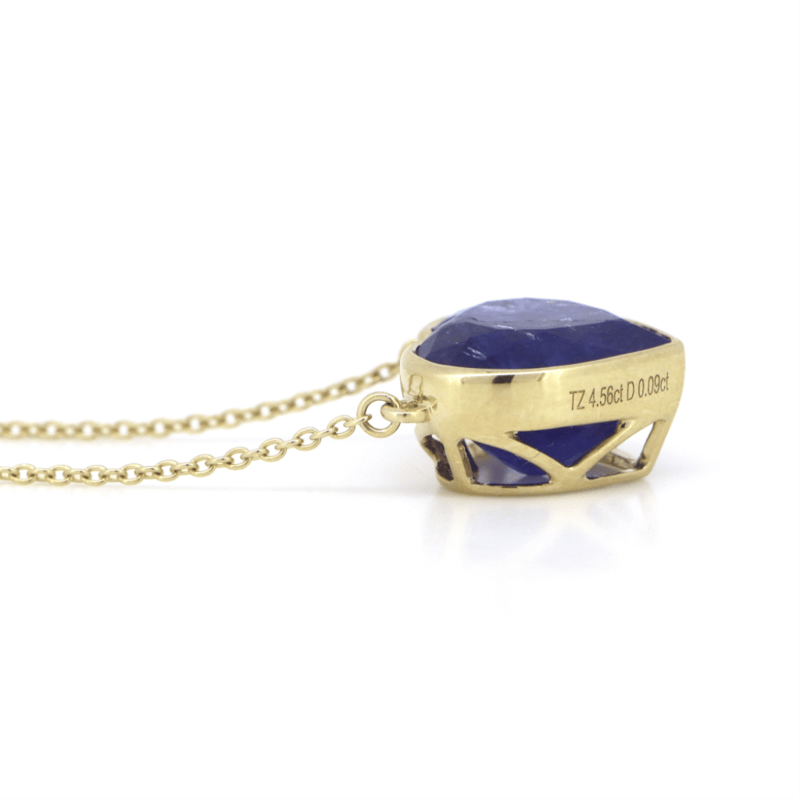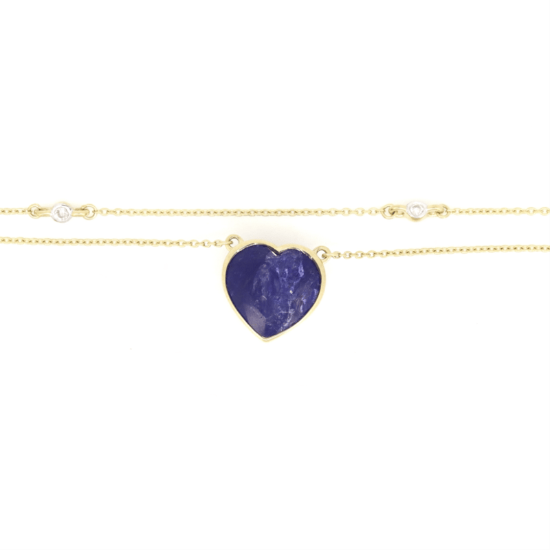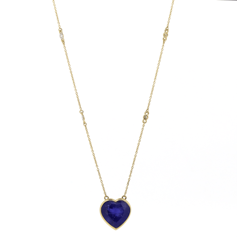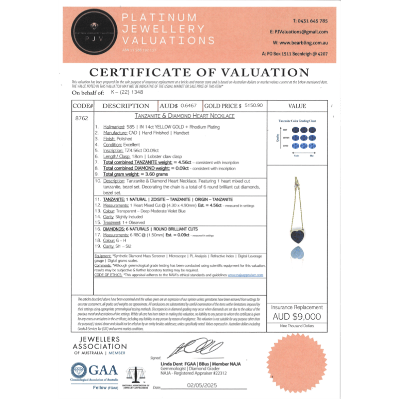 14K YELLOW GOLD, TANZANITE AND DIAMOND, HEART NECKLACE. The Centre Features, One Heart Cut, Deep Moderate Violet Blue, Tanzanite (4.56Ct, Slightly Inclusions), Bezel Set. Decorating The Chain Are, 6 Round Brilliant Cut, Diamonds (0.09Ct Tdw, G-H Colour, Si1-Si2 Clarity), Bezel Set. The Necklace Features A Lobster Claw Clasp Closure. Necklace Length Is 18Cm. Valuations Provided by an Independent Third-Party Professional Not Directly Associated With Lloyds Auctions at AUD $$9,000.00This valuation has been conducted by an independent third-party professional. The valuation amount is an assessment by the issuing valuer and does not reflect the auction value of the item. Any inquiries regarding the valuation should be directed to the issuing valuer (refer to contact details on the certificate), as Lloyds Auctions has no affiliation or influence over the valuation, the valuer, or the stated amount. Condition: Good - Refer Images 0+46