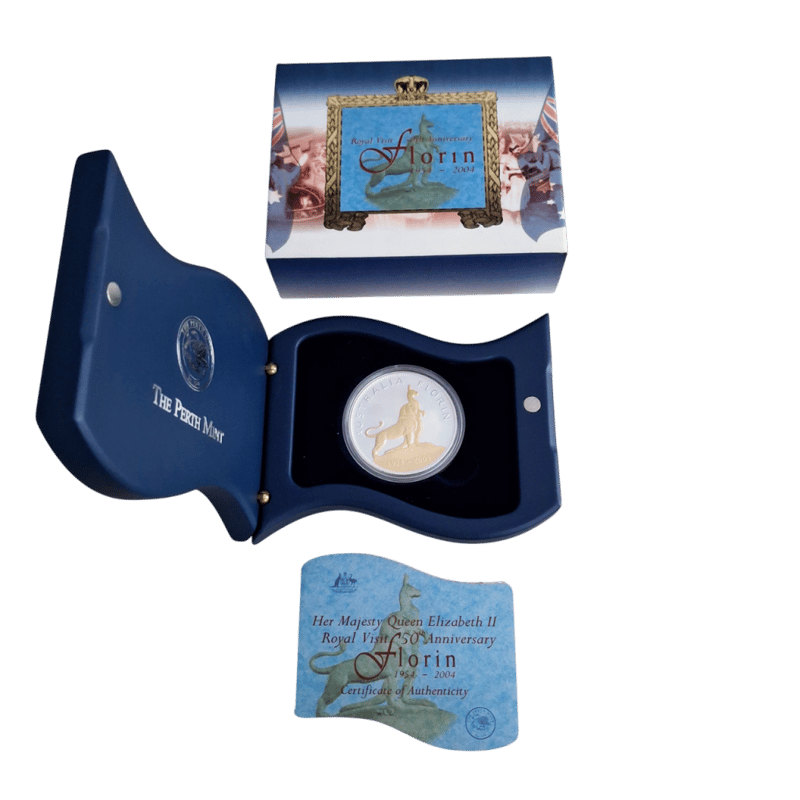 1OZ SILVER ROYAL VISIT ANNIVERSARY GILDED FLORIN 1Oz Silver Royal Visit Anniversary Gilded Florin In Australian Flag Box With Cert Condition: Unc23528+42
