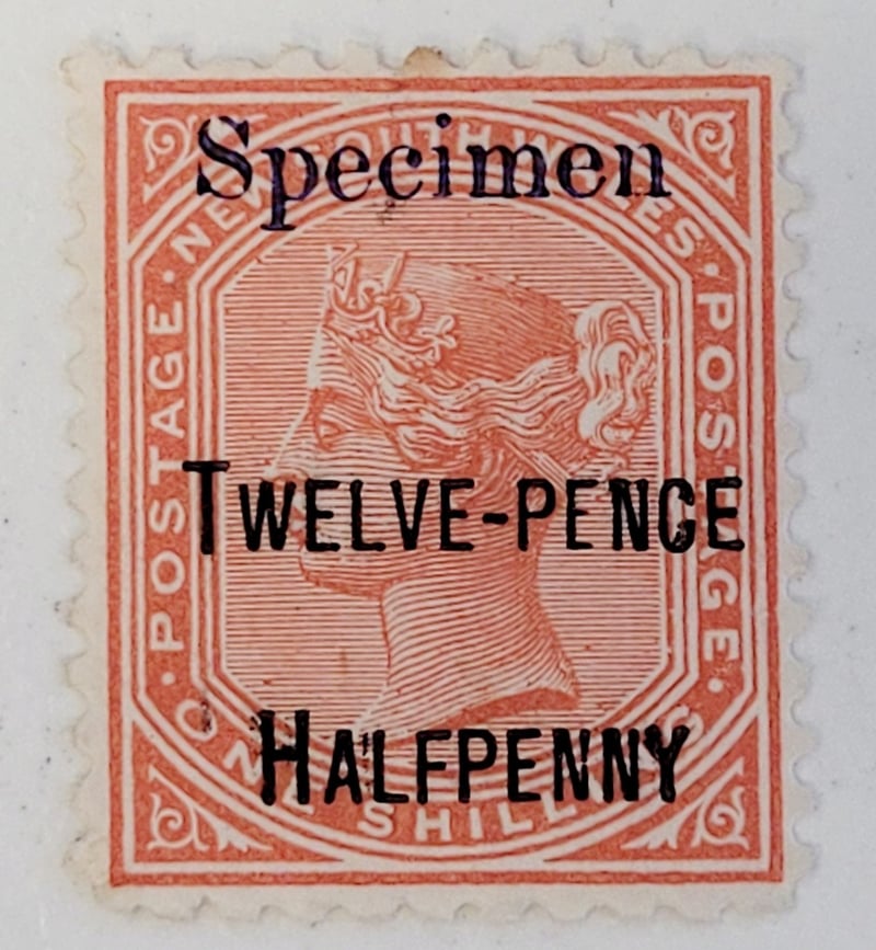 1891 12 1/2 D ON 1 SHILLING RED , " SPECIMEN" AND " TWELVE - PENCE HALFPENNY " ON 1/- SHILLI G QV MINT , PREVIOUSLY VERY LIGHTLY HINGED , FINE AND FRESH , 4 MARGINS488458+69