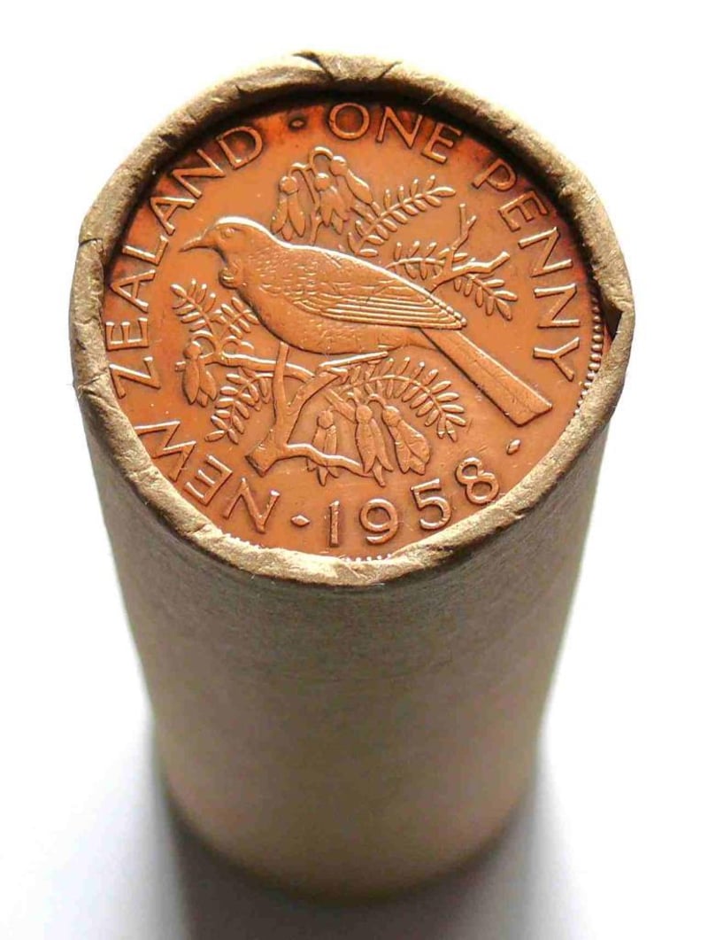 ROLL OF 1958 QEII, NEW ZEALAND PENNY (50X Circulated Coins In A Roll). 488406+7