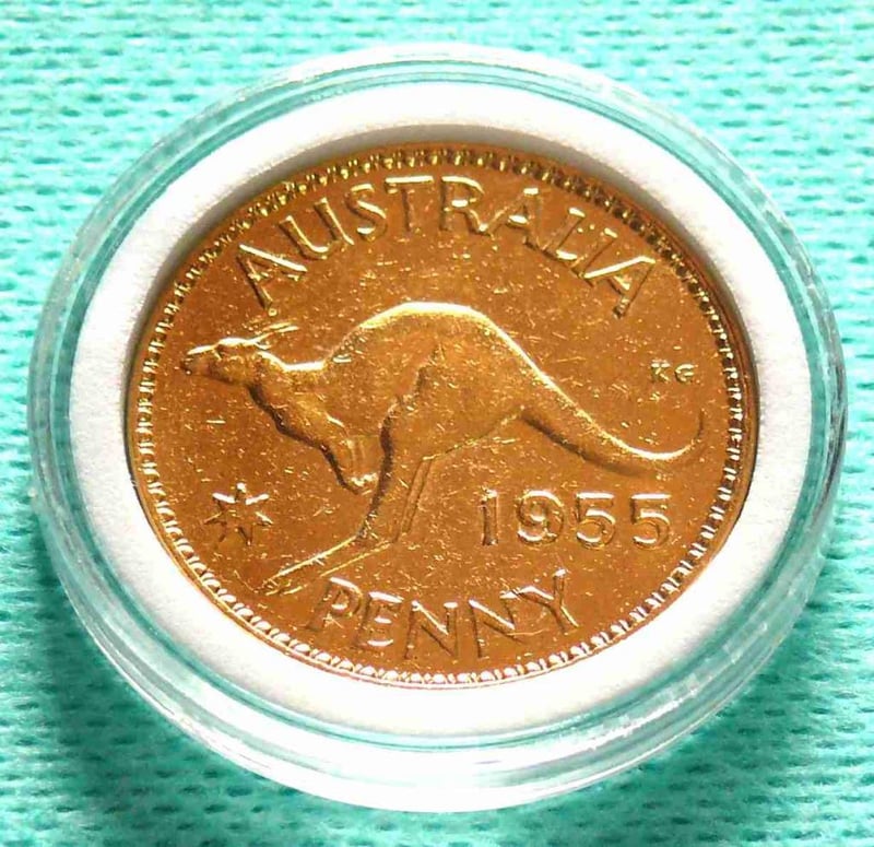 1955 QEII UNCIRCULATED 18CT. GOLD PLATED AUSTRALIAN PENNY In Protective Clear Capsule. 488406+15