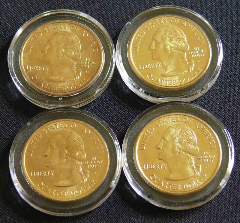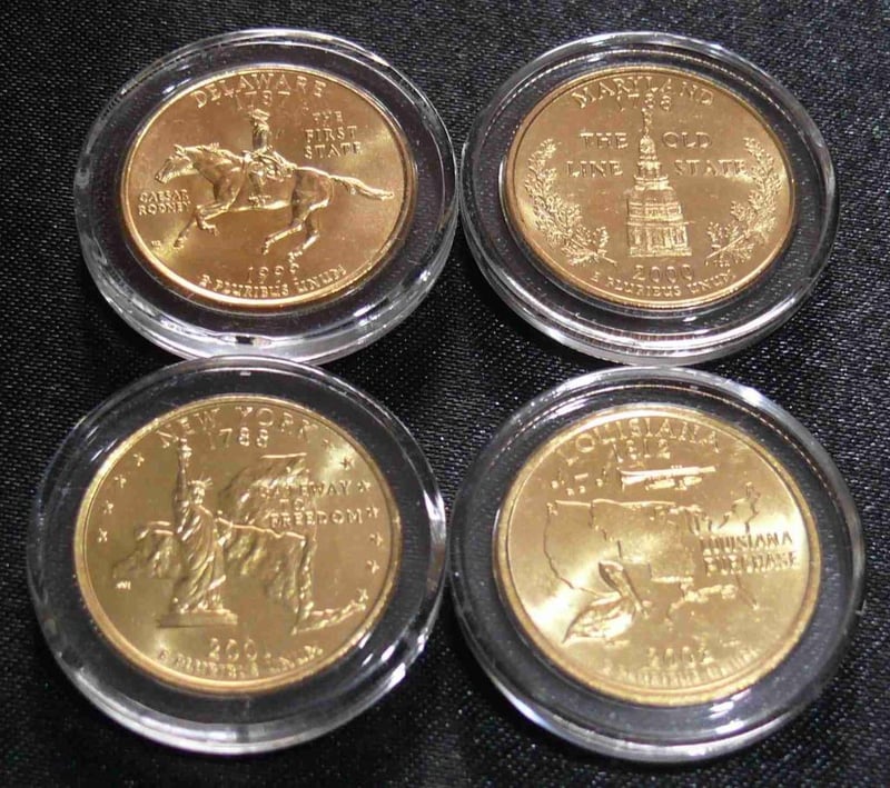 4X 24CT. GOLD PLATED STATE QUARTER With Certificate Of Authenticity, Loisiana, New York, Maryland, Delaware. 488406+48