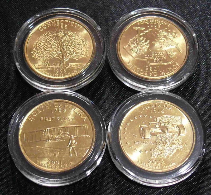 4X 24CT. GOLD PLATED STATE QUARTER With Certificate Of Authenticity, Indiana, North Carolina, South Carolina, Connecticut. 488406+49