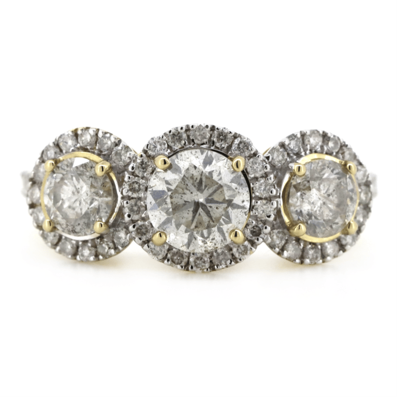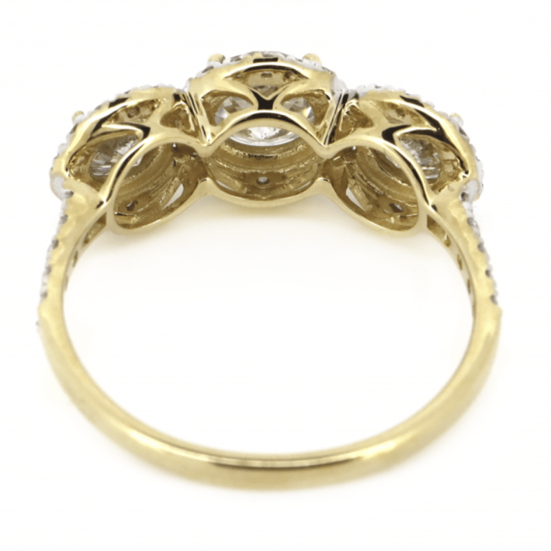 14K YELLOW GOLD AND DIAMOND, TRILOGY HALO RING. The Central Design Features, 3 Round Brilliant Cut, Diamonds (1.26Ct, J-K Colour, P1-P2 Clarity), 4 Claw Set. Surrounding The Centers In Individual Halos And Decorating The Band Are, 54 Round Brilliant Cut, Diamonds (0.33Ct Tdw, L-K Colour, Si2-P2 Clarity), Claw Set. Ring Size N. Valuations Provided by an Independent Third-Party Professional Not Directly Associated With Lloyds Auctions at AUD $$15,850.00This valuation has been conducted by an independent third-party professional. The valuation amount is an assessment by the issuing valuer and does not reflect the auction value of the item. Any inquiries regarding the valuation should be directed to the issuing valuer (refer to contact details on the certificate), as Lloyds Auctions has no affiliation or influence over the valuation, the valuer, or the stated amount. Condition: Good - Refer Images 0645911+40