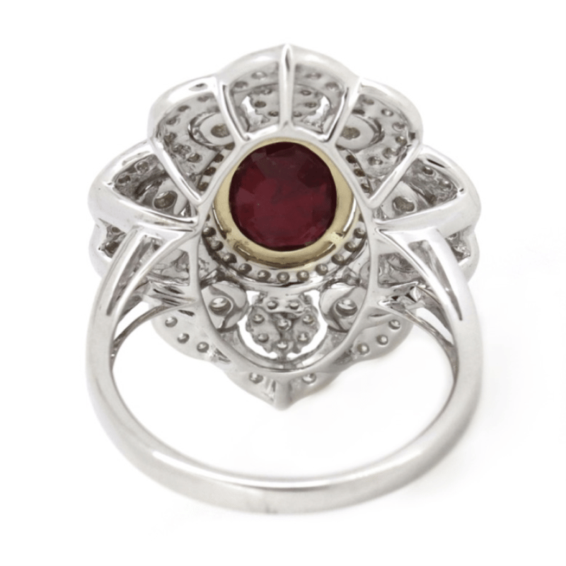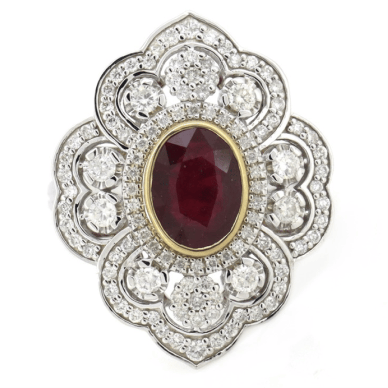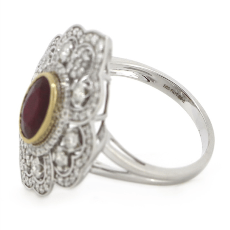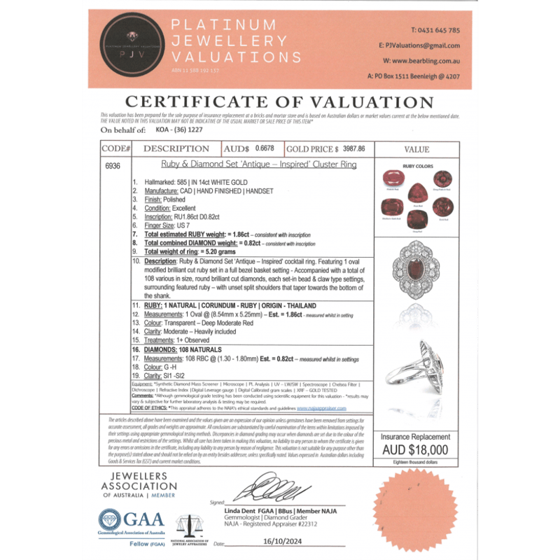 14K WHITE GOLD, RUBY AND DIAMOND, ANTIQUE INSPIRED RING. The Centre Features, One Oval Modified Cut, Deep Moderate Red, Ruby (1.86Ct, Moderate-Heavy Inclusions, Enhanced), Bezel Set In Yellow Gold. Encompassing The Design Are, 108 Round Brilliant Cut, Diamonds (0.82Ct Tdw, G-H Colour, Si1-Si2 Clarity), Bead/Claw Set. Ring Size N. Valuations Provided by an Independent Third-Party Professional Not Directly Associated With Lloyds Auctions at AUD $$18,000.00This valuation has been conducted by an independent third-party professional. The valuation amount is an assessment by the issuing valuer and does not reflect the auction value of the item. Any inquiries regarding the valuation should be directed to the issuing valuer (refer to contact details on the certificate), as Lloyds Auctions has no affiliation or influence over the valuation, the valuer, or the stated amount. Condition: Good - Refer Images 0645911+38