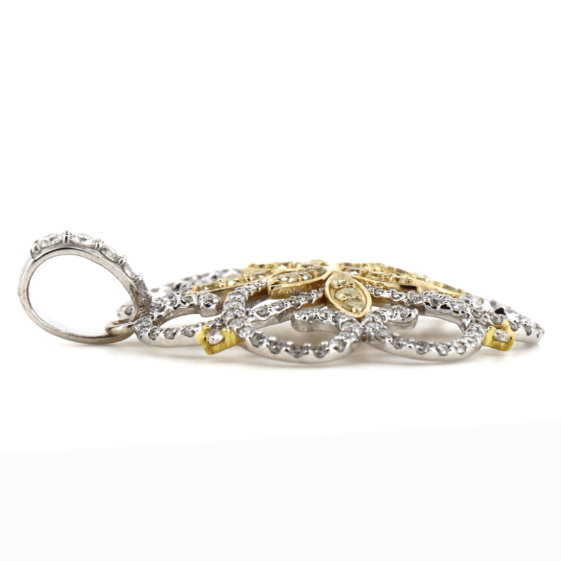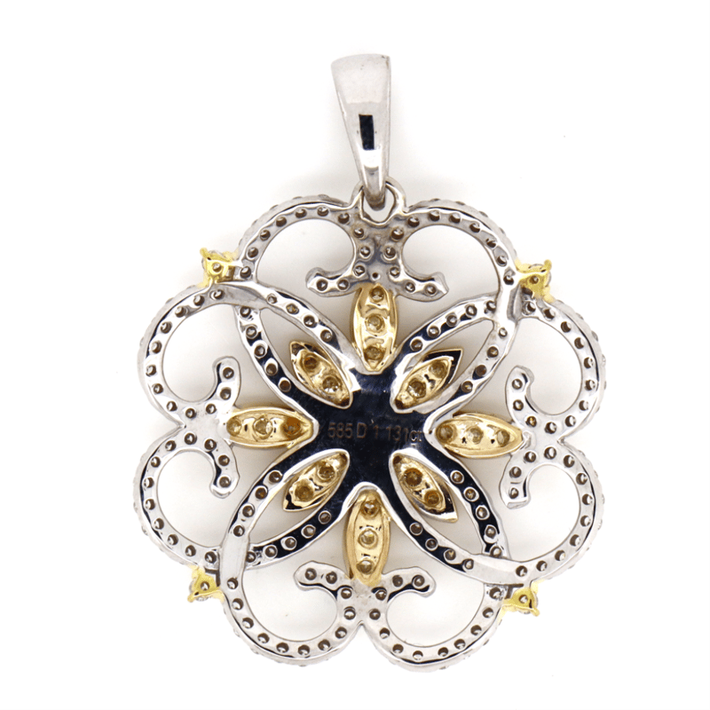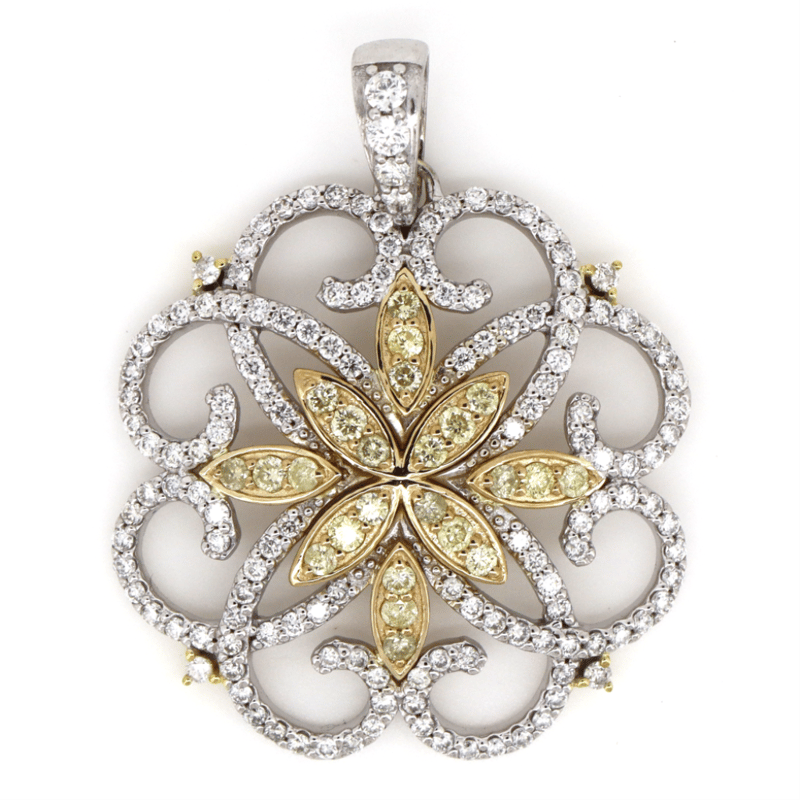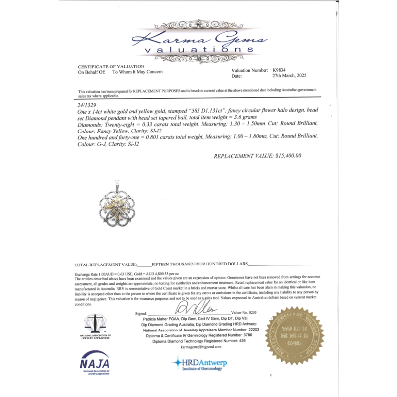 14K WHITE/YELLOW GOLD, FANCY YELLOW DIAMOND, DECORATIVE HALO PENDANT. The Pendant Features 28 Round Brilliant Cut, Fancy Yellow, Diamonds (0.33Ct Tdw, Si-I2 Clarity), Bezel Set In Yellow Gold. Encompassing The Design And Decorating The Bail Are, 141 Round Brilliant Cut, Diamonds (0.801Ct Tdw, G-J Colour, Si-I2 Clarity), Bead Set In White Gold. Valuations Provided by an Independent Third-Party Professional Not Directly Associated With Lloyds Auctions at AUD $$15,400.00This valuation has been conducted by an independent third-party professional. The valuation amount is an assessment by the issuing valuer and does not reflect the auction value of the item. Any inquiries regarding the valuation should be directed to the issuing valuer (refer to contact details on the certificate), as Lloyds Auctions has no affiliation or influence over the valuation, the valuer, or the stated amount. Condition: Good - Refer Images 0645911+17