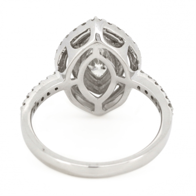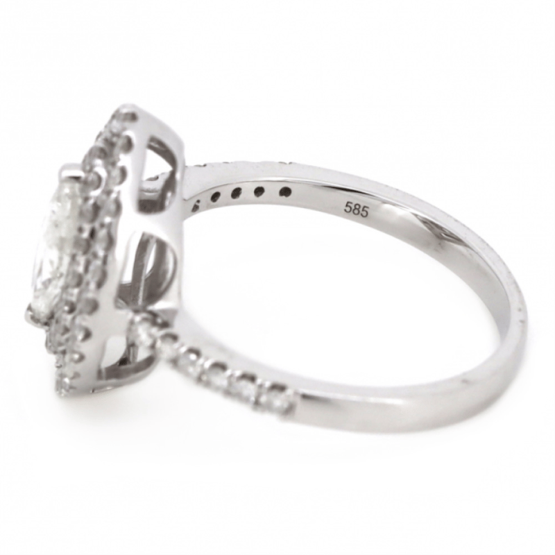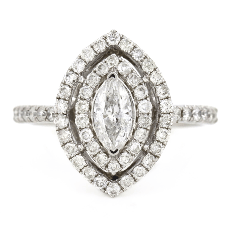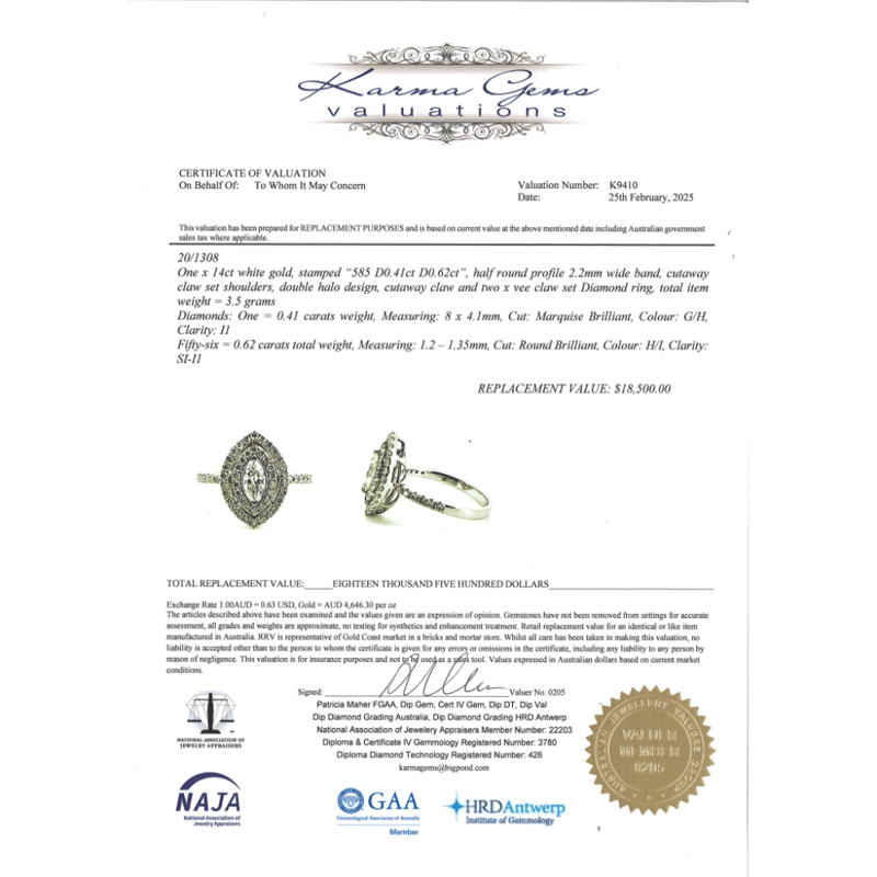 14K WHITE GOLD AND DIAMOND, DOUBLE HALO RING. The Centre Features, One Marquise Cut, Diamond (0.41Ct, G-H Colour, I1 Clarity), Claw Set. Surrounding The Centre In A Double Halo And Decorating The Band Are, 56 Round Brilliant Cut, Diamonds (0.62Ct Tdw, H-I Colour, Si-I1 Clarity), Claw Set. Ring Size M 1/2. Valuations Provided by an Independent Third-Party Professional Not Directly Associated With Lloyds Auctions at AUD $$18,500.00This valuation has been conducted by an independent third-party professional. The valuation amount is an assessment by the issuing valuer and does not reflect the auction value of the item. Any inquiries regarding the valuation should be directed to the issuing valuer (refer to contact details on the certificate), as Lloyds Auctions has no affiliation or influence over the valuation, the valuer, or the stated amount. Condition: Good - Refer Images 0645911+7