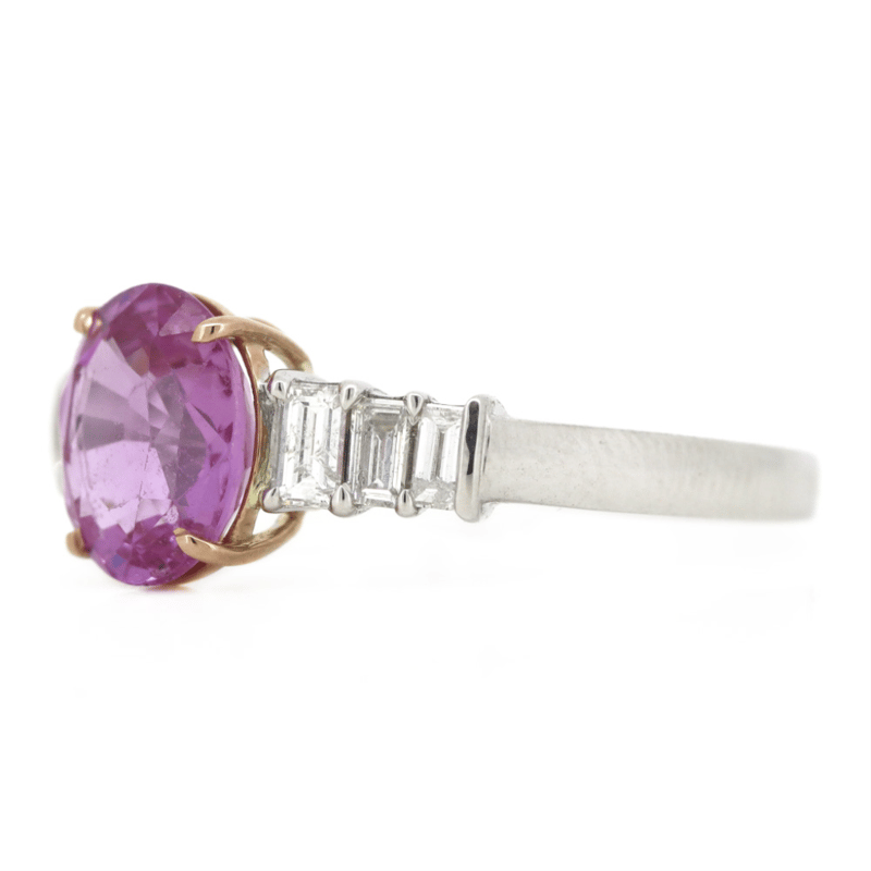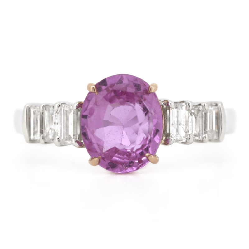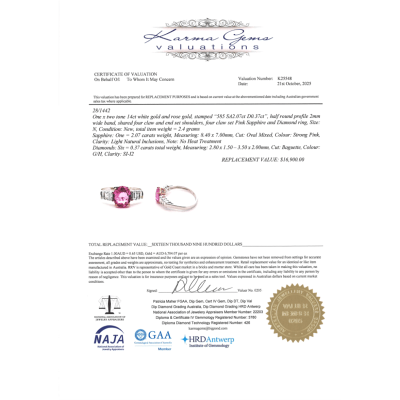 14K WHITE/ROSE GOLD, PINK SAPPHIRE AND DIAMOND, DRESS RING. The Centre Features, One Oval Cut, Strong Pink, Sapphire (2.07Ct, Light Natural Inclusions, No Heat Treatment), 4 Claw Set. Flanking The Centre And Decorating The Band Are, 6 Baguette Cut, Diamonds (0.37Ct Tdw, G-H Colour, Si-I2 Clarity), Shared 4 Claw Set. Ring Size N. Valuations Provided by an Independent Third-Party Professional Not Directly Associated With Lloyds Auctions at AUD $$16,900.00This valuation has been conducted by an independent third-party professional. The valuation amount is an assessment by the issuing valuer and does not reflect the auction value of the item. Any inquiries regarding the valuation should be directed to the issuing valuer (refer to contact details on the certificate), as Lloyds Auctions has no affiliation or influence over the valuation, the valuer, or the stated amount. Condition: Good - Refer Images 0645911+19