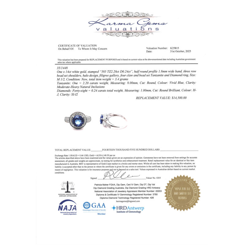 14K WHITE GOLD, TANZANITE AND DIAMOND, HALO RING. The Centre Features, One Round Cut, Vivid Blue, Tanzanite (2.20Ct, Moderate-Heavy Inclusions), 4 Claw Set. Surrounding The Centre In A Halo And Decorating The Band Are, 48 Round Brilliant Cut, Diamonds (0.24Ct Tdw, H-J Colour, Si-I2 Clarity), Bead Set In White Gold. Ring Size M 1/2. Valuations Provided by an Independent Third-Party Professional Not Directly Associated With Lloyds Auctions at AUD $$14,500.00This valuation has been conducted by an independent third-party professional. The valuation amount is an assessment by the issuing valuer and does not reflect the auction value of the item. Any inquiries regarding the valuation should be directed to the issuing valuer (refer to contact details on the certificate), as Lloyds Auctions has no affiliation or influence over the valuation, the valuer, or the stated amount. Condition: Good - Refer Images 0645911+21