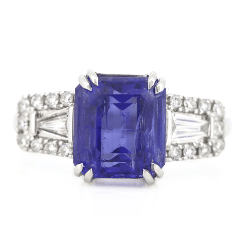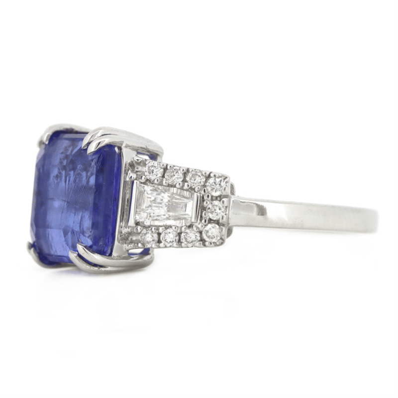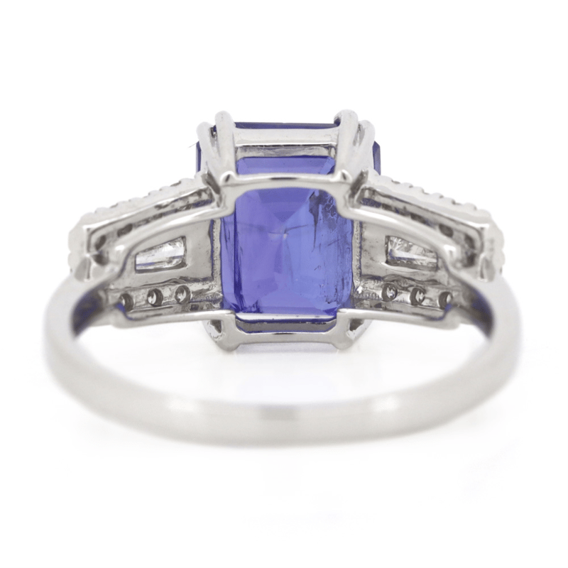14K WHITE GOLD, TANZANITE AND DIAMOND, DRESS RING. The Centre Features, One Emerald Cut, Vivid Blue, Tanzanite (3.62Ct, Moderate Natural Inclusions), Double Claw Set. Flanking The Centre Are, 18 Round Brilliant (0.16Ct Tdw, H Colour, Si Clarity) And 2 Baguette Cut, Diamonds (0.17Ct Tdw, H Colour, Vs Clarity), Bead/Bar Set. Ring Size M 1/2. Valuations Provided by an Independent Third-Party Professional Not Directly Associated With Lloyds Auctions at AUD $$14,900.00This valuation has been conducted by an independent third-party professional. The valuation amount is an assessment by the issuing valuer and does not reflect the auction value of the item. Any inquiries regarding the valuation should be directed to the issuing valuer (refer to contact details on the certificate), as Lloyds Auctions has no affiliation or influence over the valuation, the valuer, or the stated amount. Condition: Good - Refer Images 0645911+28