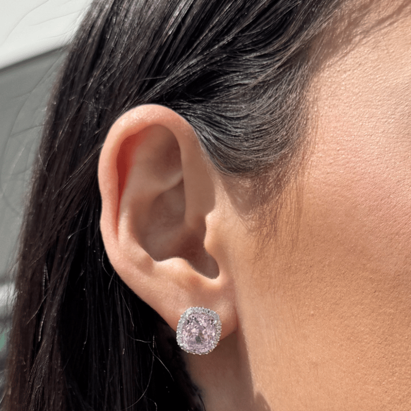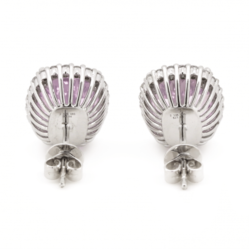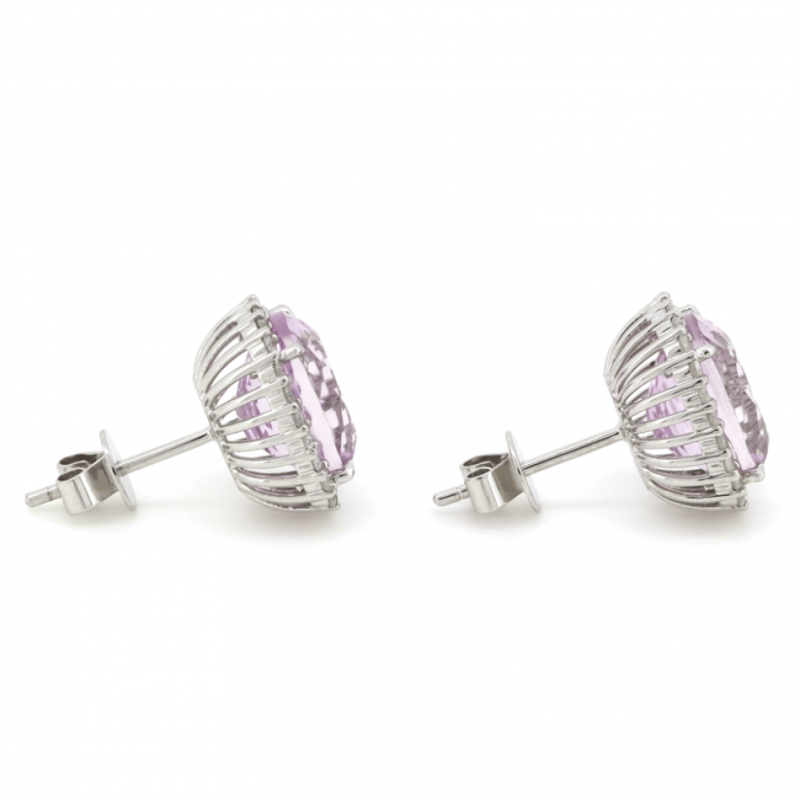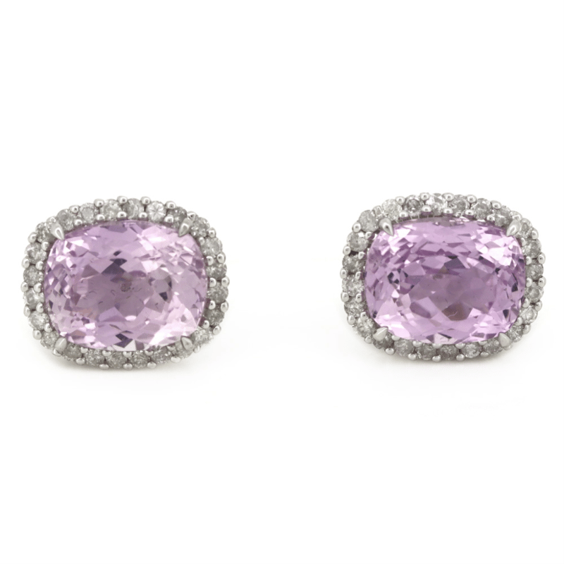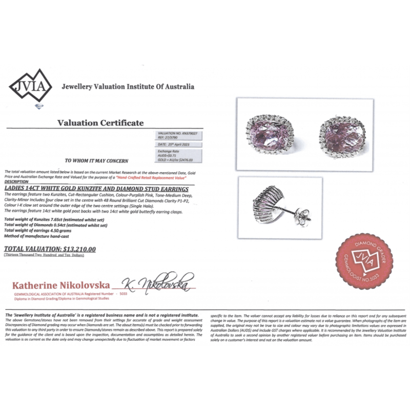 14K WHITE GOLD, KUNZITE AND DIAMOND, HALO STUD EARRINGS. The Centres Feature, 2 Rectangular Cushion Cut, Medium-Deep Purplish-Pink, Kunzites (7.65Ct Tsw, Minor Inclusions), 4 Claw Set. Surrounding The Centres In Halos Are, 48 Round Brilliant Cut, Diamonds (0.54Ct Tdw, I-K Colour, P1-P2 Clarity), Claw Set. The Earrings Have Post Backs With 14K White Gold Butterfly Clasps. Valuations Provided by an Independent Third-Party Professional Not Directly Associated With Lloyds Auctions at AUD $$13,210.00This valuation has been conducted by an independent third-party professional. The valuation amount is an assessment by the issuing valuer and does not reflect the auction value of the item. Any inquiries regarding the valuation should be directed to the issuing valuer (refer to contact details on the certificate), as Lloyds Auctions has no affiliation or influence over the valuation, the valuer, or the stated amount. Condition: Good - Refer Images 0645911+29