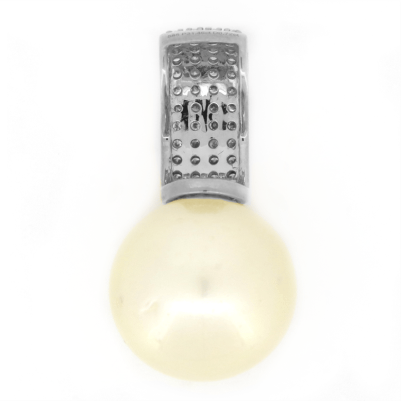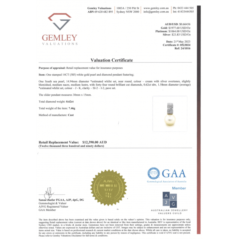 14K WHITE GOLD, WHITE CULTURED SOUTH SEA PEARL AND DIAMOND, DROP PENDANT. The Drop Features, One Near Round, Cream With Silver Overtones, Cultured South Sea Pearl (14.94Mm Size, Medium Lustre, Slightly Blemished). Decorating The Bail Are, 44 Round Brilliant Cut, Diamonds (0.62Ct Tdw, J-K Colour, Si2-I2 Clarity), Pave Set. Valuations Provided by an Independent Third-Party Professional Not Directly Associated With Lloyds Auctions at AUD $$12,390.00This valuation has been conducted by an independent third-party professional. The valuation amount is an assessment by the issuing valuer and does not reflect the auction value of the item. Any inquiries regarding the valuation should be directed to the issuing valuer (refer to contact details on the certificate), as Lloyds Auctions has no affiliation or influence over the valuation, the valuer, or the stated amount. Condition: Good - Refer Images 0645911+43