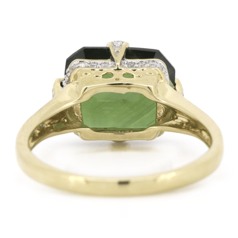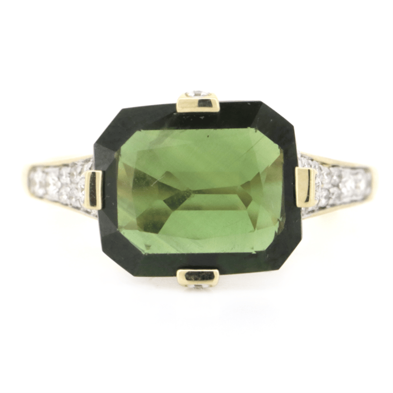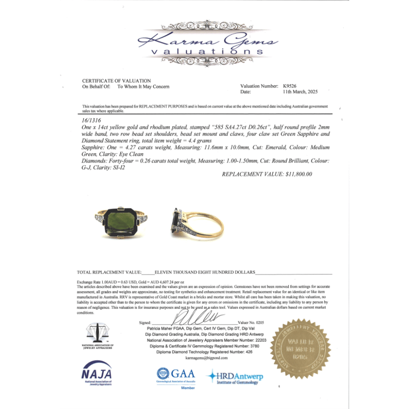 14K YELLOW GOLD, GREEN SAPPHIRE AND DIAMOND, DRESS RING. The Centre Features, One Emerald Cut, Medium Green, Sapphire (4.27Ct, Eye Clean Clarity), Claw Set. Decorating The Setting Are, 44 Round Brilliant Cut, Diamonds (0.26Ct Tdw, G-J Colour, Si-I2 Clarity), Bead Set In White Gold. Ring Size Q. Valuations Provided by an Independent Third-Party Professional Not Directly Associated With Lloyds Auctions at AUD $$11,800.00This valuation has been conducted by an independent third-party professional. The valuation amount is an assessment by the issuing valuer and does not reflect the auction value of the item. Any inquiries regarding the valuation should be directed to the issuing valuer (refer to contact details on the certificate), as Lloyds Auctions has no affiliation or influence over the valuation, the valuer, or the stated amount. Condition: Good - Refer Images 0645911+31