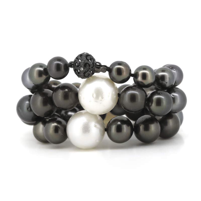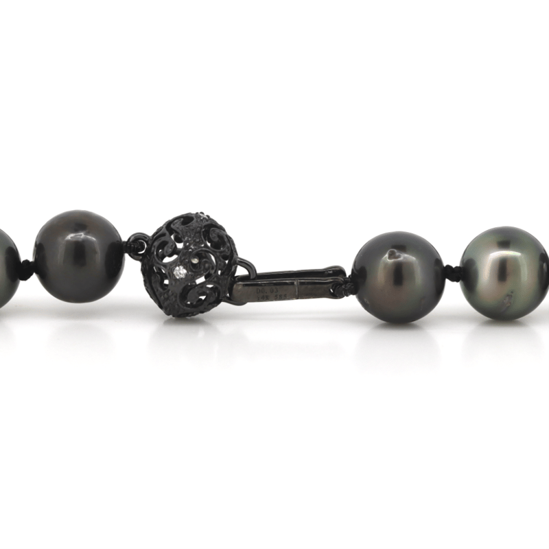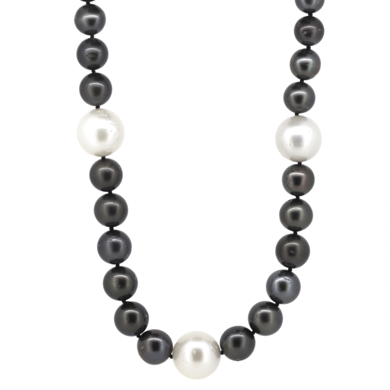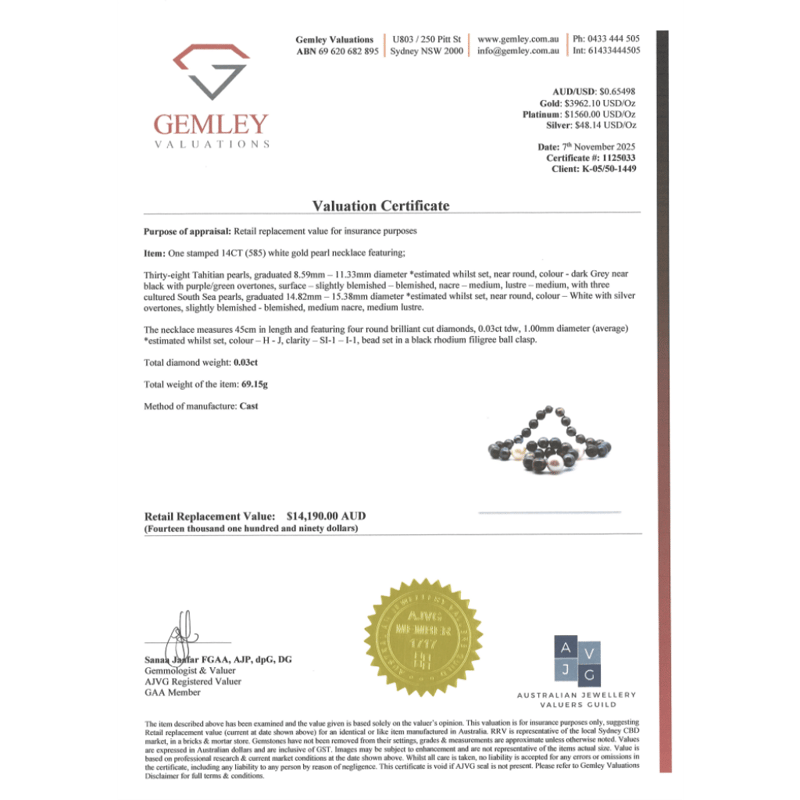 14K WHITE GOLD, GREY/BLACK TAHITIAN, WHITE CULTURED SOUTH SEA PEARL AND DIAMOND, STRAND NECKLACE. The Design Features, 3 Near Round, White With Silver Overtones, Cultured South Sea Pearls (14.82Mm-15.38Mm, Medium Lustre, Slight Blemishes), And 38 Near Round, Dark Grey/Black With Purple/Green Overtones, Tahitian Pearls, With Silver Overtones (8.59Mm-11.33Mm Size, Medium Lustre, Slight Blemishes), Strung In A Single Row, Graduating In Size. Embellishing The 14K White Gold, Black Rhodium-Plated Filigree Ball Clasp Are, 4 Round Brilliant Cut, Diamonds (0.03Ct Tdw, H-J Colour, Si1-I1 Clarity), Bead Set. Necklace Length Is 45Cm. Valuations Provided by an Independent Third-Party Professional Not Directly Associated With Lloyds Auctions at AUD $$14,190.00This valuation has been conducted by an independent third-party professional. The valuation amount is an assessment by the issuing valuer and does not reflect the auction value of the item. Any inquiries regarding the valuation should be directed to the issuing valuer (refer to contact details on the certificate), as Lloyds Auctions has no affiliation or influence over the valuation, the valuer, or the stated amount. Condition: Good - Refer Images 0645911+15