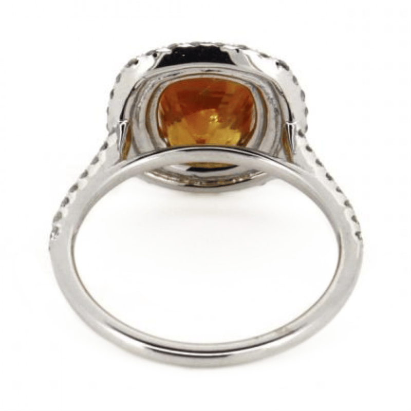 14K WHITE GOLD, ORANGE SAPPHIRE AND DIAMOND, DOUBLE HALO RING. The Centre Features, One Cushion Cut, Yellowish-Orange, Sapphire (2.92Ct, Minor Eye Visible Inclusions), 4 Claw Set. Surrounded By, 68 Round Brilliant Cut, Diamonds (0.74Ct Tdw, J-K Colour, Si2-I2 Clarity), Micro-Claw Set. Ring Size N. Valuations Provided by an Independent Third-Party Professional Not Directly Associated With Lloyds Auctions at AUD $$11,290.00This valuation has been conducted by an independent third-party professional. The valuation amount is an assessment by the issuing valuer and does not reflect the auction value of the item. Any inquiries regarding the valuation should be directed to the issuing valuer (refer to contact details on the certificate), as Lloyds Auctions has no affiliation or influence over the valuation, the valuer, or the stated amount. Condition: Good - Refer Images 0645911+36