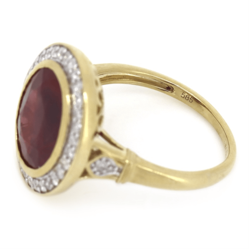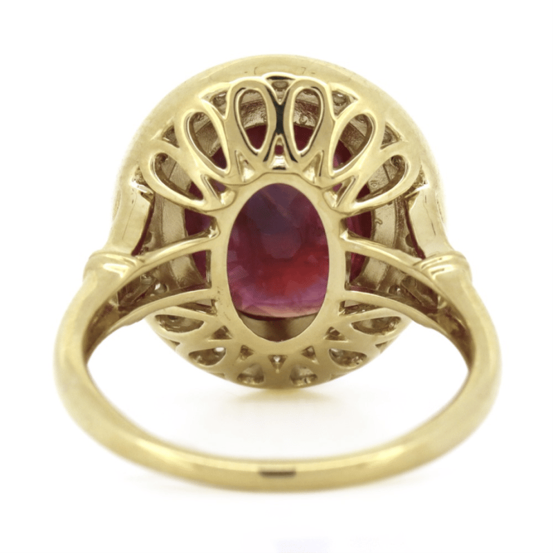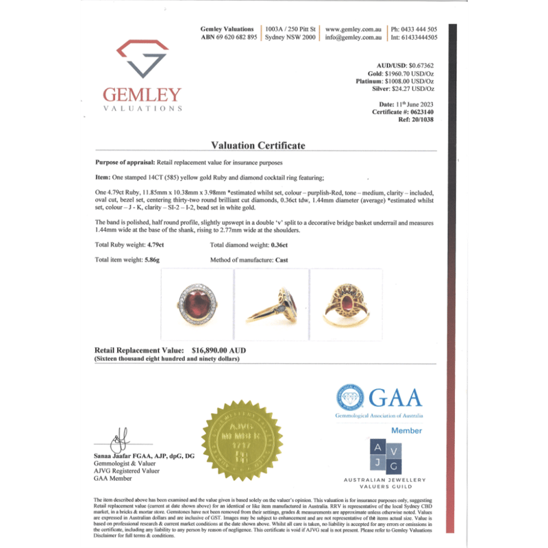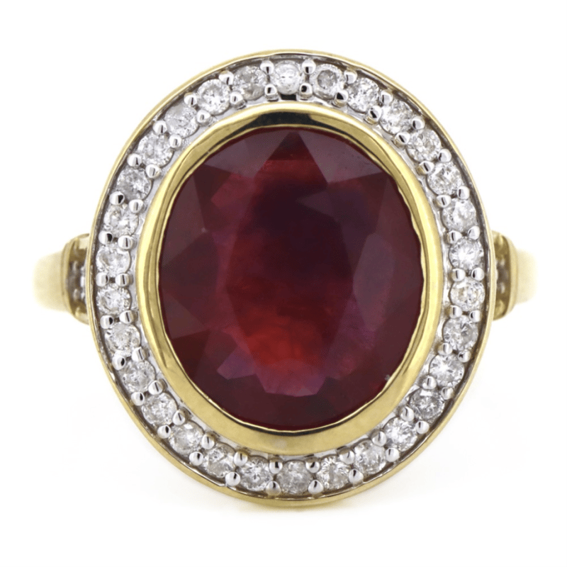 14K YELLOW GOLD, RUBY AND DIAMOND, HALO RING. The Centre Features, One Oval Cut, Medium Purplish-Red, Ruby (4.79Ct, Included), Bezel Set. Surrounding The Centre Are. 32 Round Brilliant Cut, Diamonds (0.36Ct Tdw, J-K Colour, Si2-I2 Clarity), Bead Set In White Gold. Ring Size O. Valuations Provided by an Independent Third-Party Professional Not Directly Associated With Lloyds Auctions at AUD $$16,890.00This valuation has been conducted by an independent third-party professional. The valuation amount is an assessment by the issuing valuer and does not reflect the auction value of the item. Any inquiries regarding the valuation should be directed to the issuing valuer (refer to contact details on the certificate), as Lloyds Auctions has no affiliation or influence over the valuation, the valuer, or the stated amount. Condition: Good - Refer Images 0645911+41