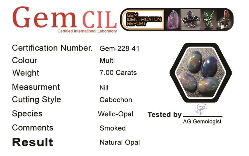 7.00 CARATS NATURAL WELLO-BLACK OPAL LOT 7.00 Carats Natural Wello-Black Opal LotStone = OpalWeight = 7.00 CaratsColour = Multi-Colour Treatment = SmokedCut = Cabochon Note = Picture Taken Under Light, Gem Cil, Certified. Condition: Good - Refer Images 0488410+41