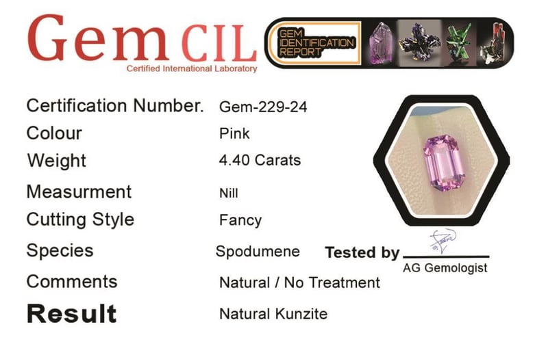 3.76 CARATS NATURAL TOP QUALITY PURPLISH-PINK KUNZITE 3.76 Carats Natural Top Quality Purplish-Pink Kunzite Stone = Natural KunziteWeight = 3.76 Carats Colour = Purplish-PinkCut = Fancy Lustre = ExcellentNote = Gem Cil, Certified, Precise Custom Cut (Not Commercial) Condition: Good - Refer Images 0488412+24