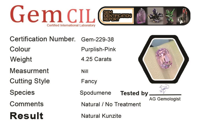 4.14 CARATS NATURAL TOP QUALITY PURPLISH-PINK KUNZITE 4.14 Carats Natural Top Quality Purplish-Pink Kunzite Stone = Natural KunziteWeight = 4.14 Carats Colour = Purplish-PinkCut = Fancy Lustre = ExcellentNote = Gem Cil, Certified, Precise Custom Cut (Not Commercial) Condition: Good - Refer Images 0488412+38