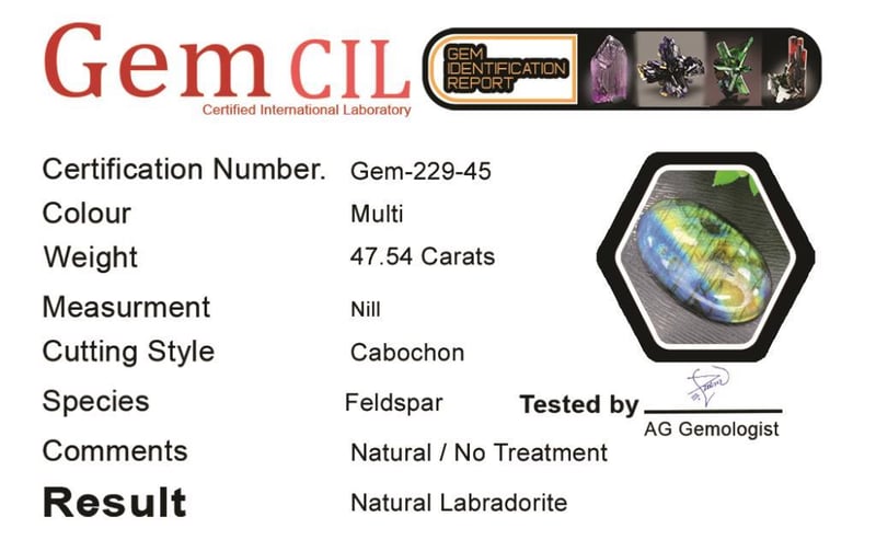 46.18 CARATS NATURAL LABRADORITE 46.18 Carats Natural Labradorite Stone = LabradoriteWeight = 46.18 CaratsColour = MultiCut = CabochonTreatment = No, Natural Quantity = 1Note = Gem Cil, Certified, Condition: Good - Refer Images 0488412+45