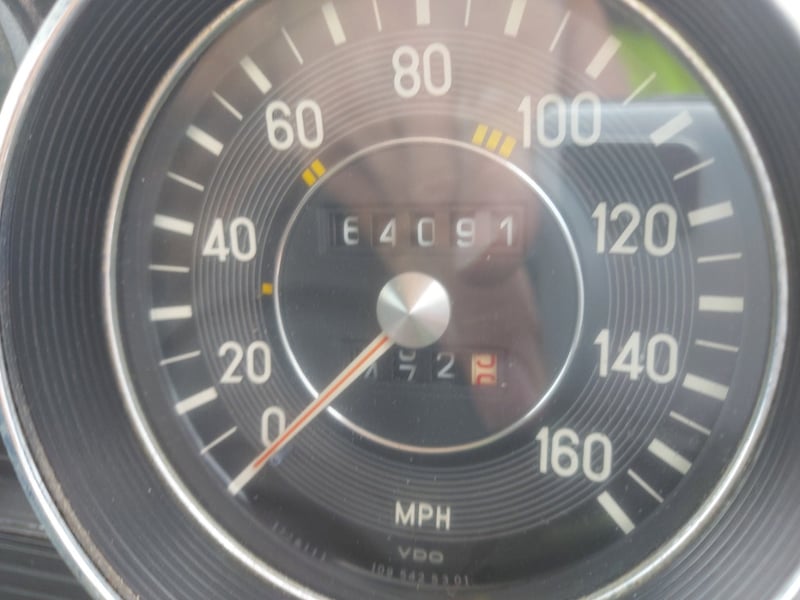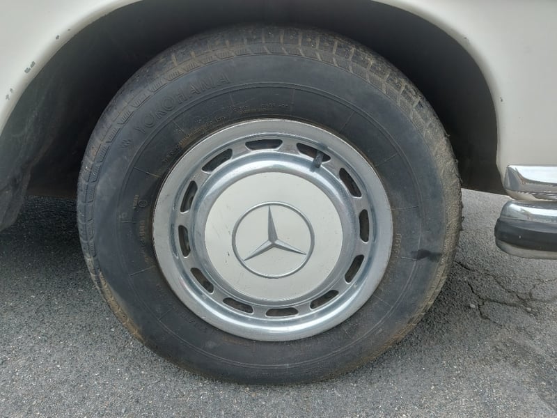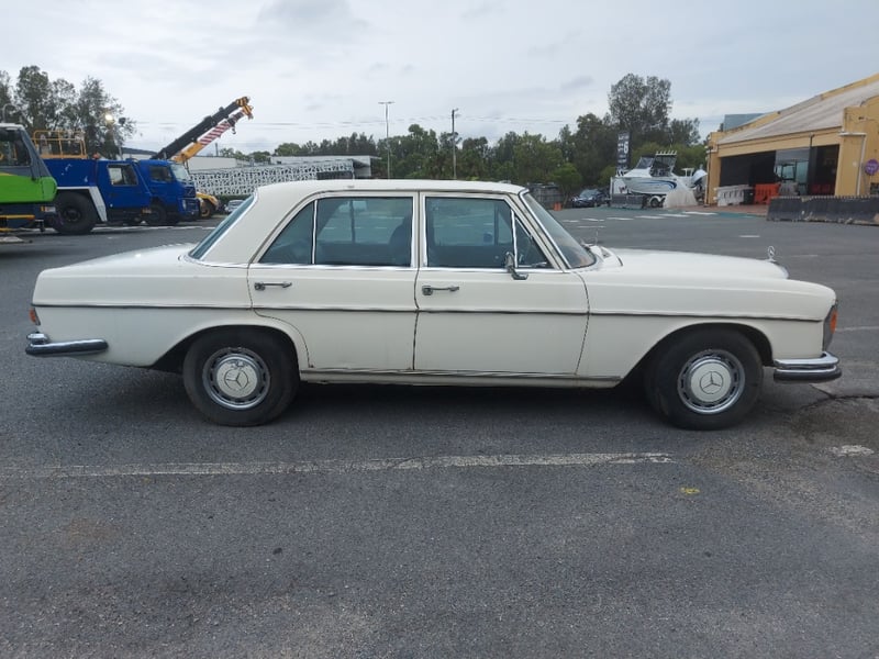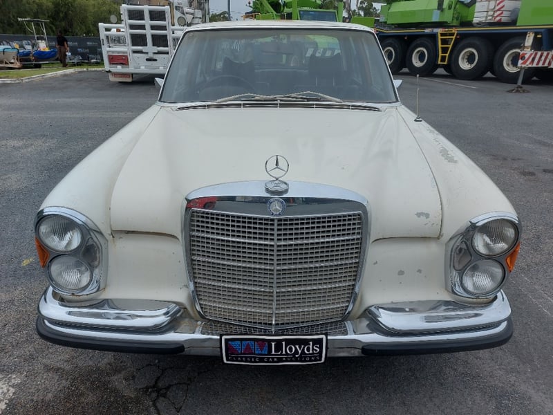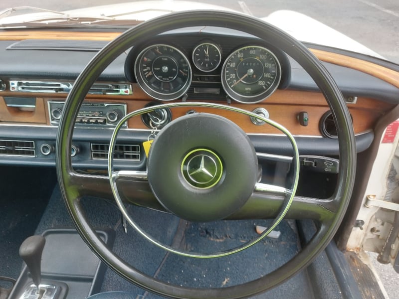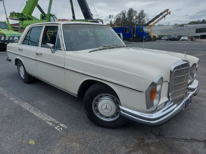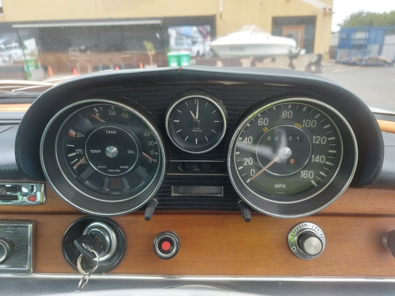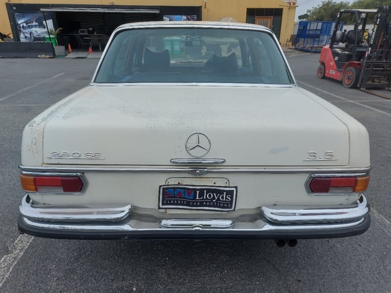 1971 Mercedes‑Benz 280 SE W108 four‑door sedan finished in white. Rear‑wheel drive configuration powered by a factory 3.5‑litre V8 petrol engine with fuel injection, paired with an automatic transmission. Odometer indicating 64,091 kilometres.