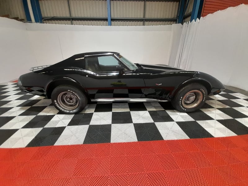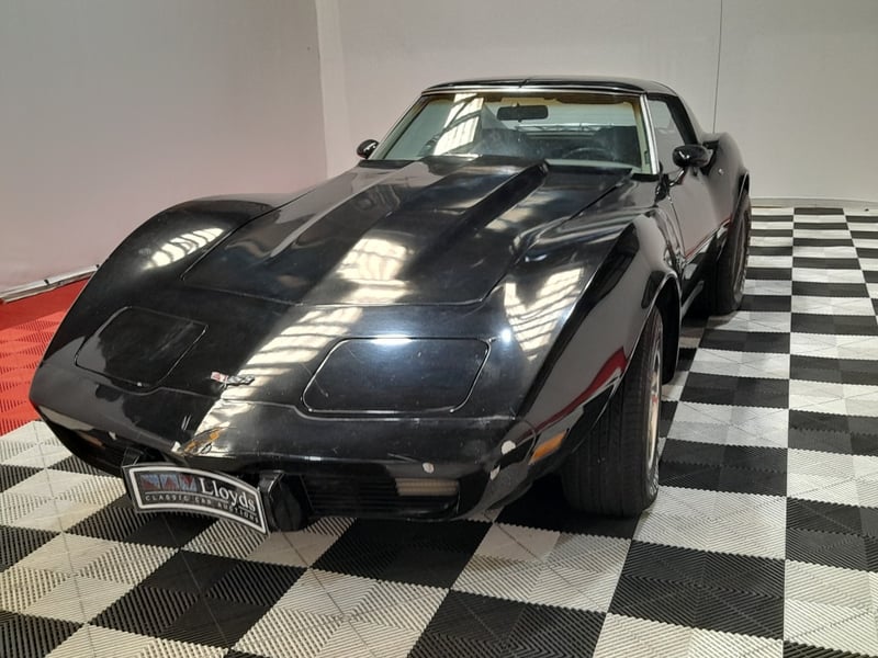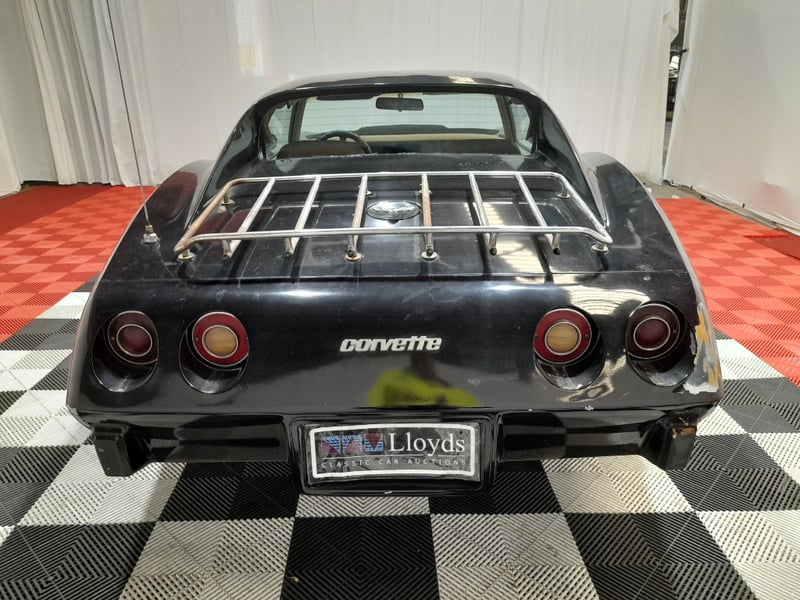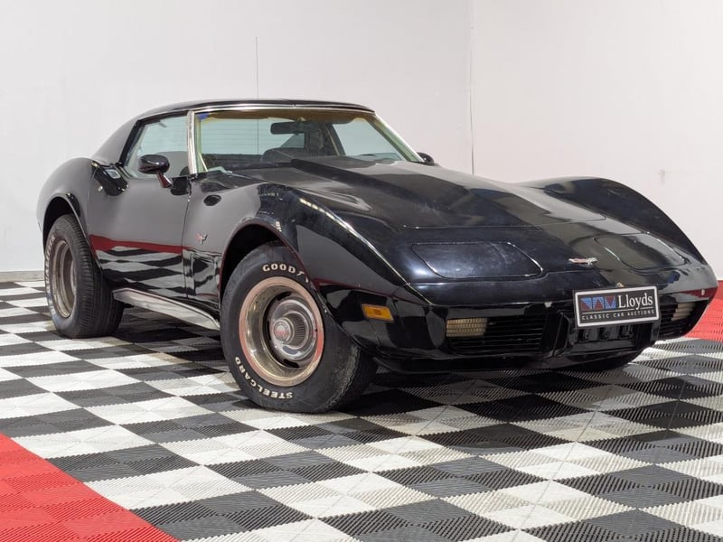 Classic C3 Corvette presented in black with contrasting red leather interior, offering iconic American sports car styling and performance. Features include comprehensive dashboard instrumentation with auxiliary gauges, wood‑trimmed steering wheel, and leather seating showing natural patina consistent with age. The removable roof panel is present, along with original luggage rack fitted to the rear. Chrome detailing and period-correct wheels fitted with Dunlop radial tyres complete the presentation.