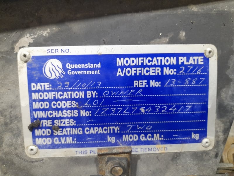 The vehicle carries a Queensland Government modification plate documenting seating capacity and GVM specifications. Cosmetic wear is present, including age-related paint wear, minor surface imperfections to exterior panels, weathering to the roof panel finish, and patina to interior upholstery and chrome fixtures. Overall condition reflects careful use and preservation. Inspection is recommended.