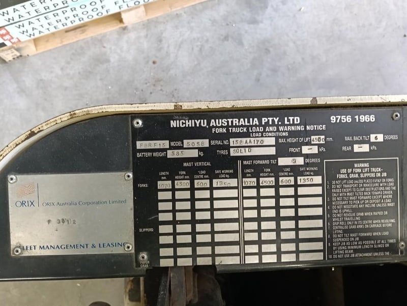 Reach Truck, Nichiyu FBRF15 50SB, orange/beige, ride-on, battery electric, 1350kg max. lift capacity, 4500mm max. lift height, 3°/6° tilt clearview mast, side shift, hour meter: 6650hr, S/N: 152AA170 with Stanbury Scarf standalone battery charger