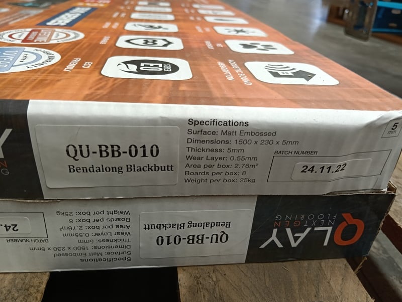 QLay NextGen Flooring, Matt Embossed, 8x Boards per Carton, Qty 4x Cartons of Bendalong Blackbutt, Refer to photo for dimension & specificationsSold as lot