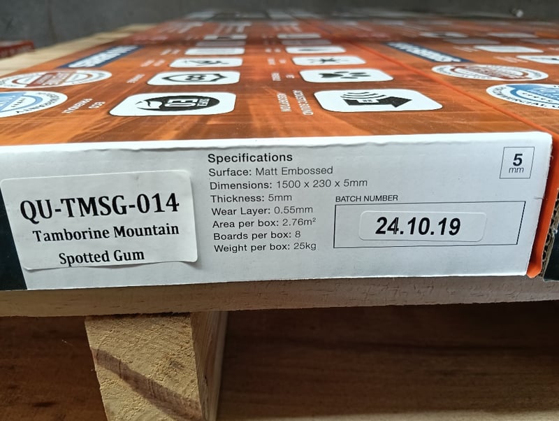 QLay NextGen Flooring, Matt Embossed, 8x Boards per Carton, Qty 3x Cartons of Tamborine Mountain Spotted Gum, Refer to photo for dimension & specificationsSold as lot