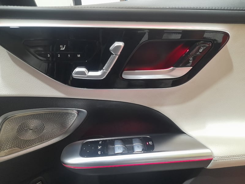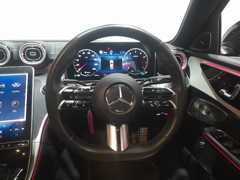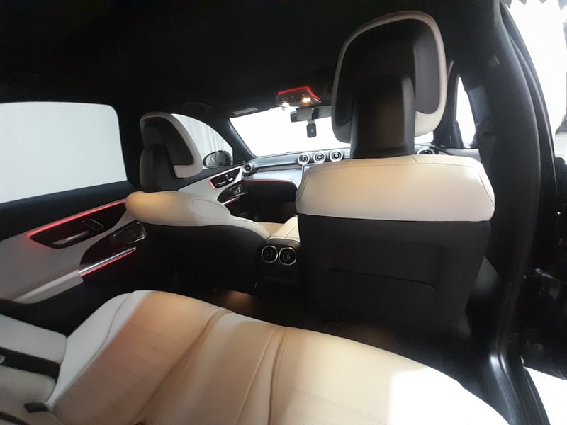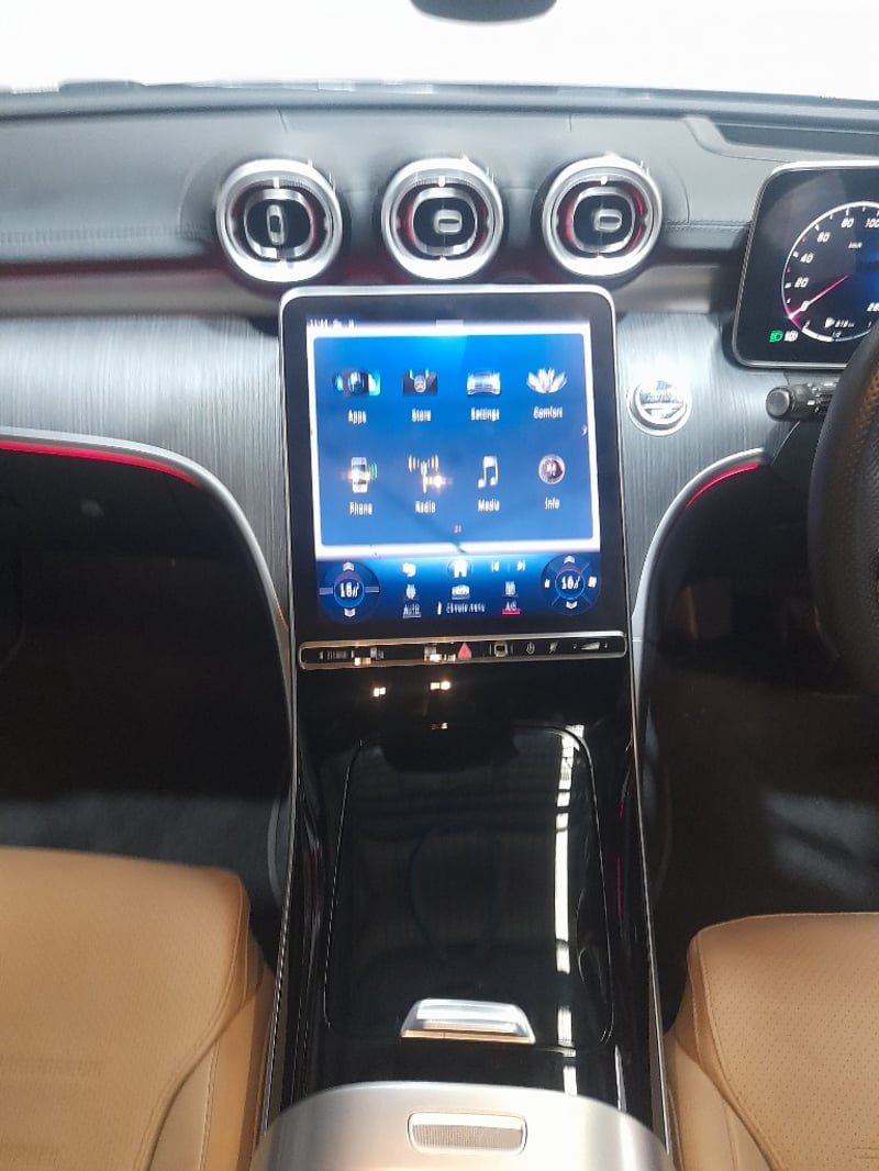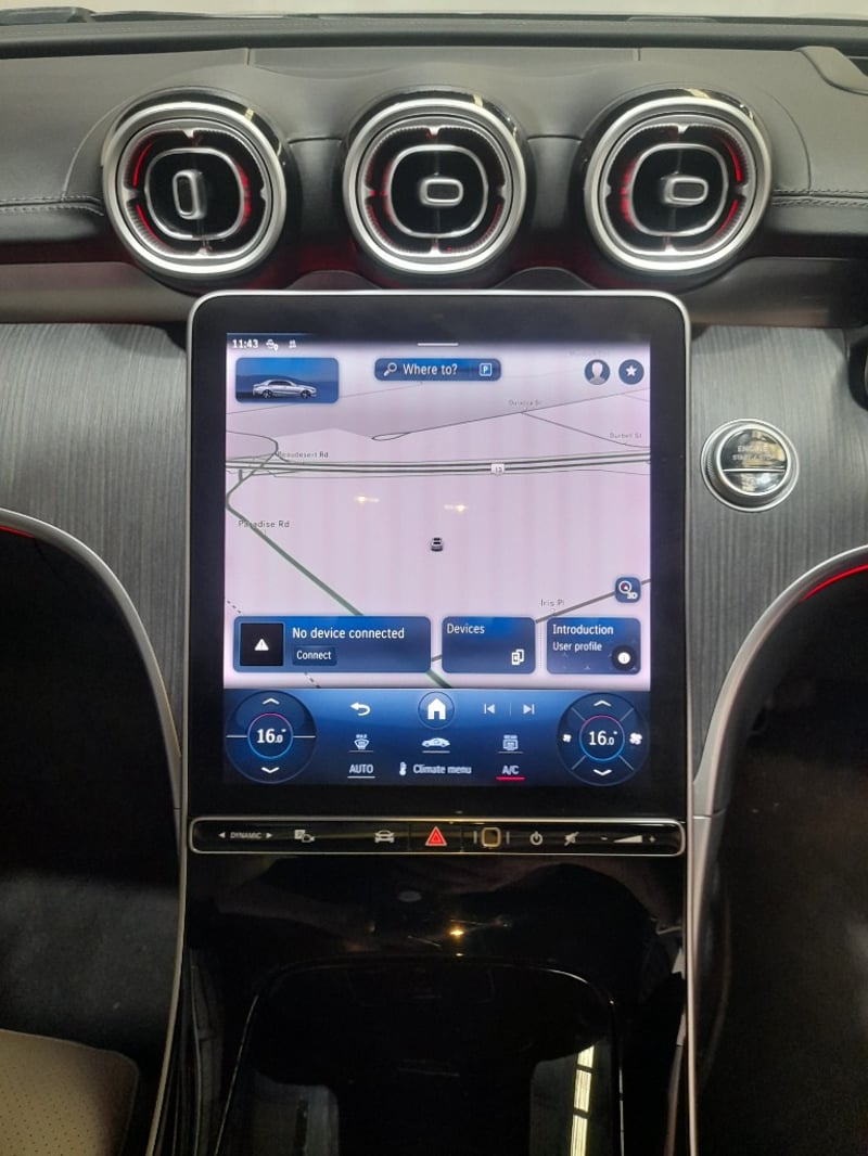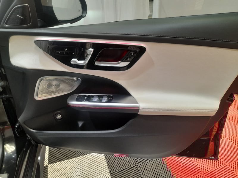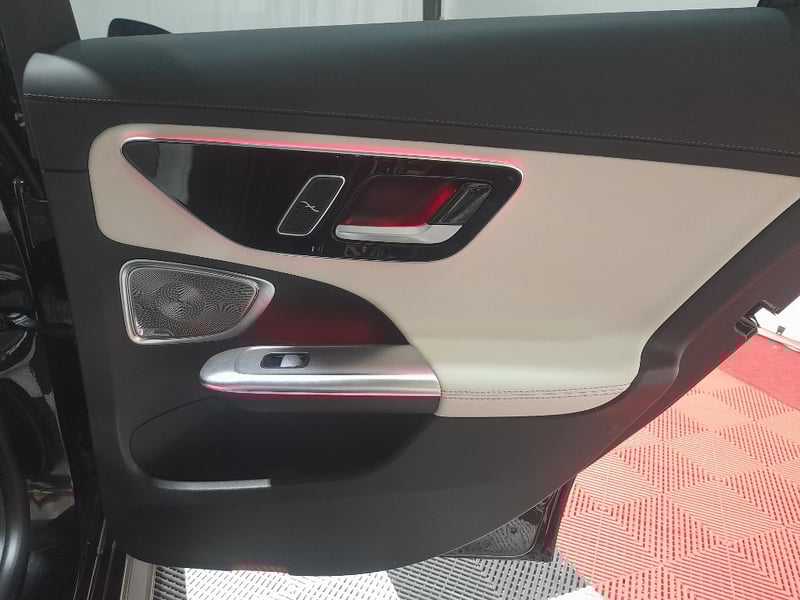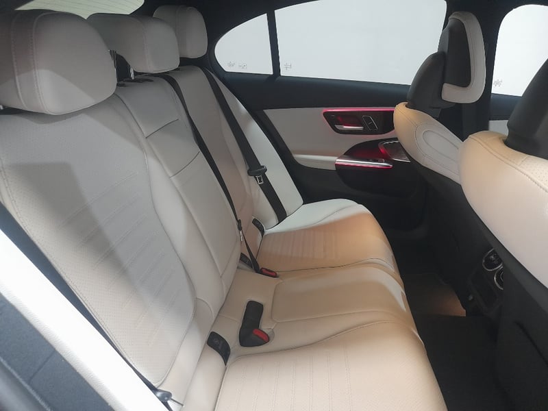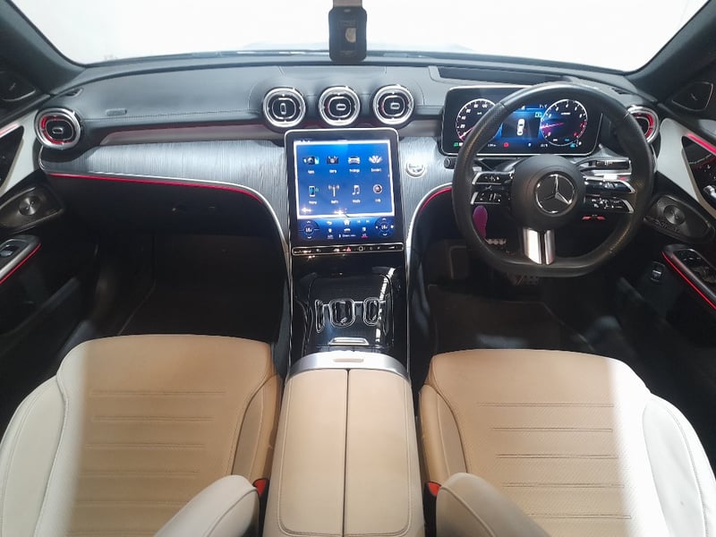 Exceptional 2024 Mercedes-Benz C200 sedan showcasing a sophisticated dual-tone exterior combining Obsidian Black Pearl with distinctive Palagonia Red accent striping. This contemporary luxury sedan features a turbocharged 2.0-litre inline four-cylinder petrol engine producing responsive performance paired with a nine-speed automatic transmission delivering refined rear-wheel-drive dynamics. The immaculate interior presents a premium two-tone colour scheme with cream and black leather upholstery featuring contrasting red stitching throughout. Advanced infotainment technology includes a large touchscreen display with navigation capability, configurable digital instrument cluster, and climate control systems. Premium appointments include illuminated door trim panels, ambient lighting, power-adjustable front seats with memory function, multi-function steering wheel controls, and comprehensive safety features. The exterior showcases contemporary Mercedes-Benz styling with LED headlights, integrated daytime running lights, signature diamond-pattern grille, and precision-engineered alloy wheels with red brake callipers visible through the design. Odometer reading of 28,433 kilometres indicates this vehicle remains virtually as new. Finished with meticulous detailing, this C200 represents modern German automotive engineering at its finest. None apparent from visual inspection. Inspection recommended.