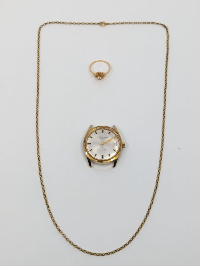 J.FARREN PRICE WATCH AND CHAIN NECKLACE AND RINGJ.Farren Price 25 Jewels Incabloc Watch, Non Numerical Hour Markers, Date Display At 3 O'Clock Position, No Bracelet,Chain Necklace, Length Approx: 61Cm (Unclasped),Ring With White Glass Stone In Centre Setting586315+7
