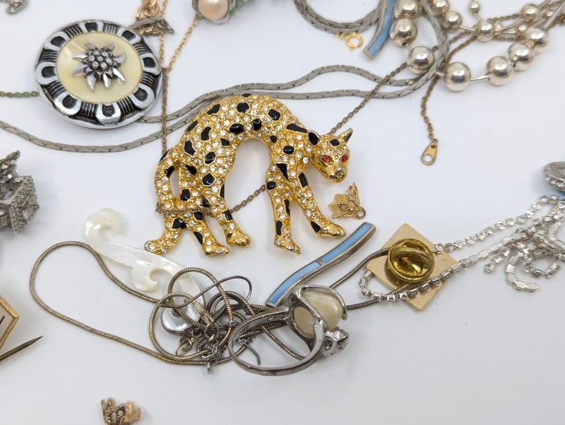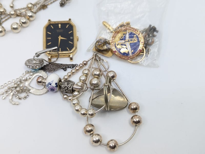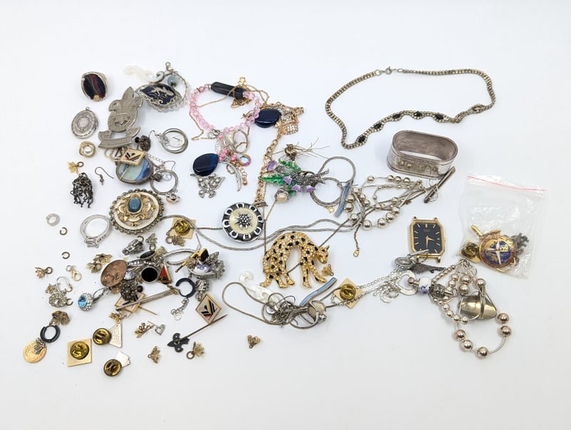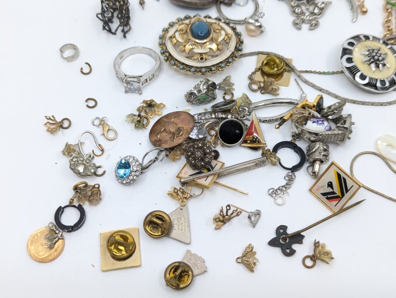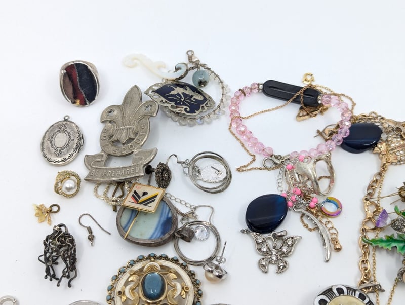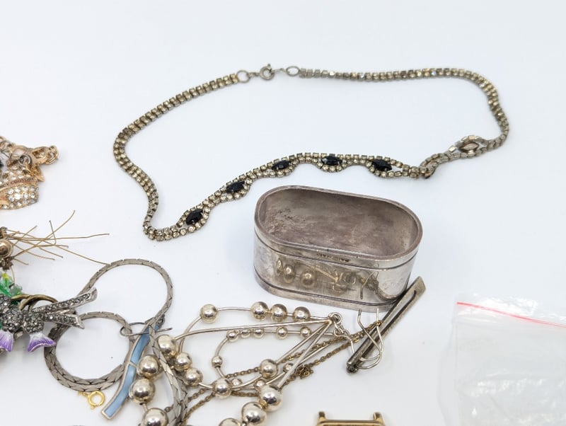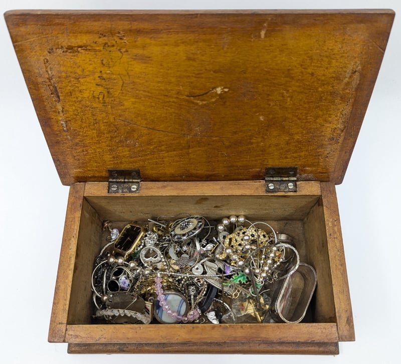 TIMBER JEWELLERY BOX WITH COLLECTION OF BROOCHES, RINGS, NECKLACES, ETCVarious Styles And Designs, Jewellery Box Size Approx: 10Cm H X 24Cm W X 14Cm D586315+9