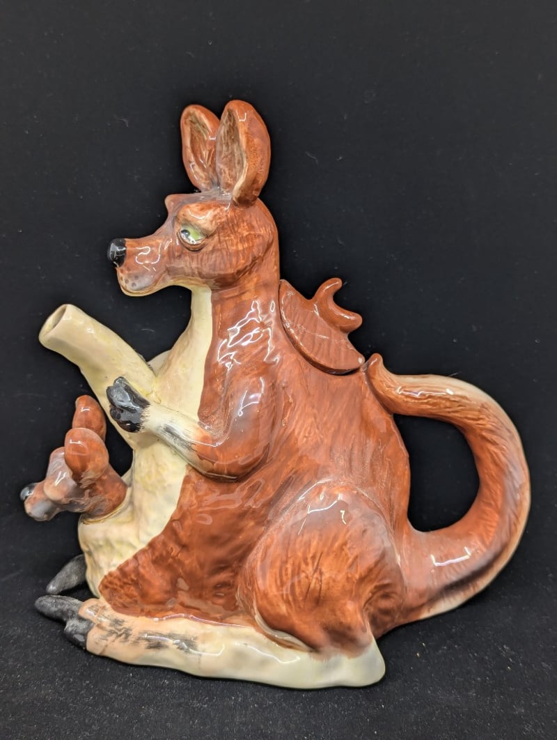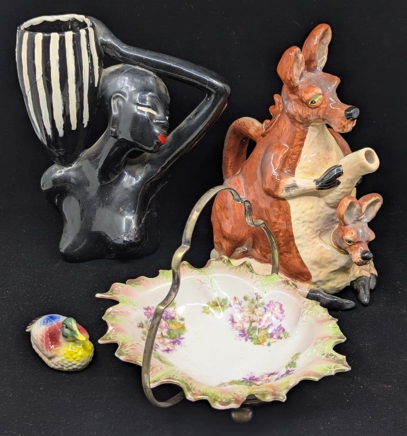 COLLECTION OF DECORATIVE HOMEWARE ITEMS Items Include: Blue Sky Kangaroo Kettle, Design Features Kangaroo With Joey In Pouch, Item Size: 23Cm H X 14Cm W X 22Cm D, Plaster Duck Figure, Size: 5Cm H X 4Cm W, Vase Featuring Figure Of Lady Carrying Bucket, Black Exterior With White Stripes, Size: 22Cm H X 19Cm W X 9Cm D, Trinket Dish With Metal Carry Frame, Dish Features Floral Imagery With Flower Style Shape, Item Size: 16Cm H X 19Cm W X 21Cm D Condition: Good - Refer To Images 6A 587779+3