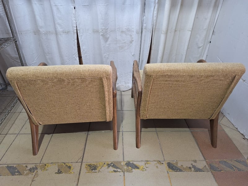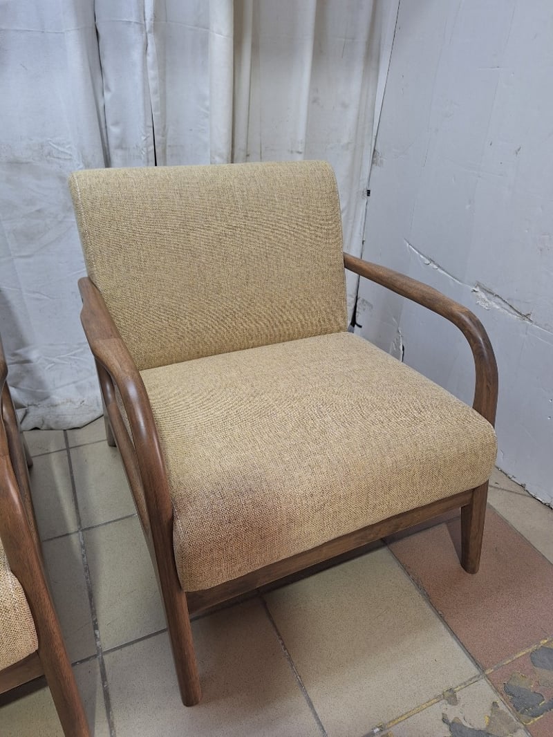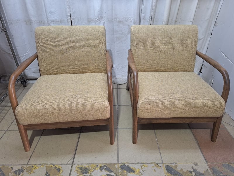 Pair Of Lounge Chairs With Cushions, Timber & Fabric Style, Yellow Finish Dimensions H:72cm W:72cm D:79cm SOLD AS LOT