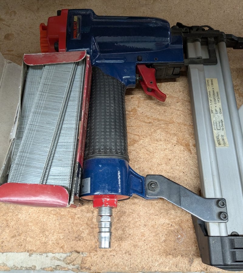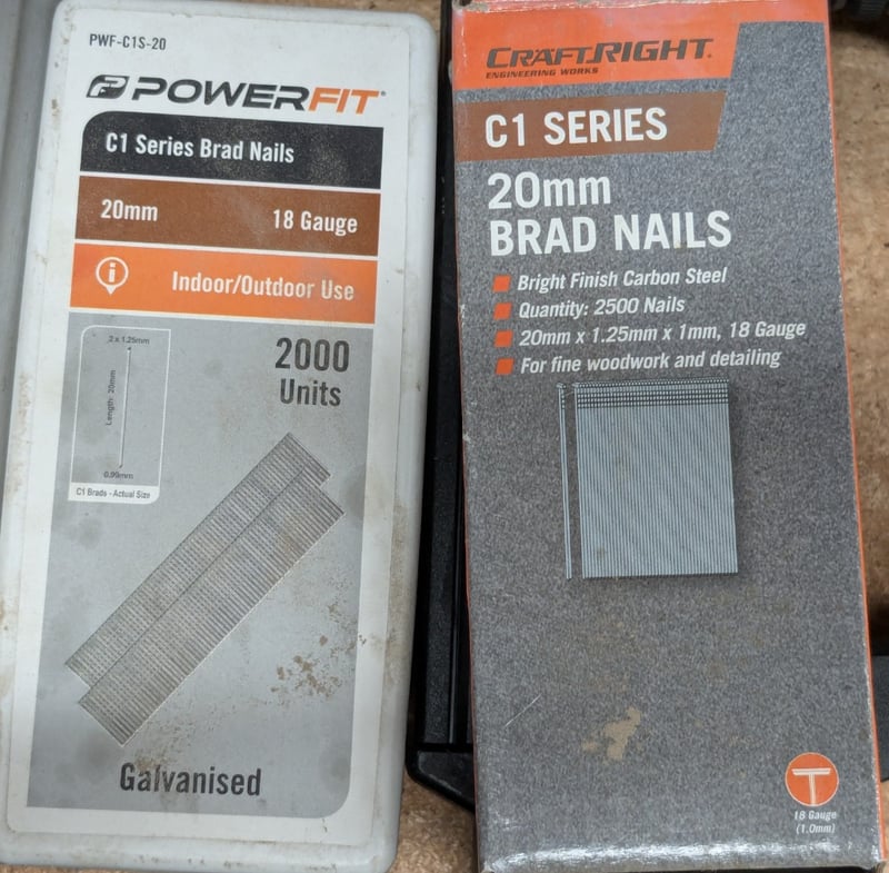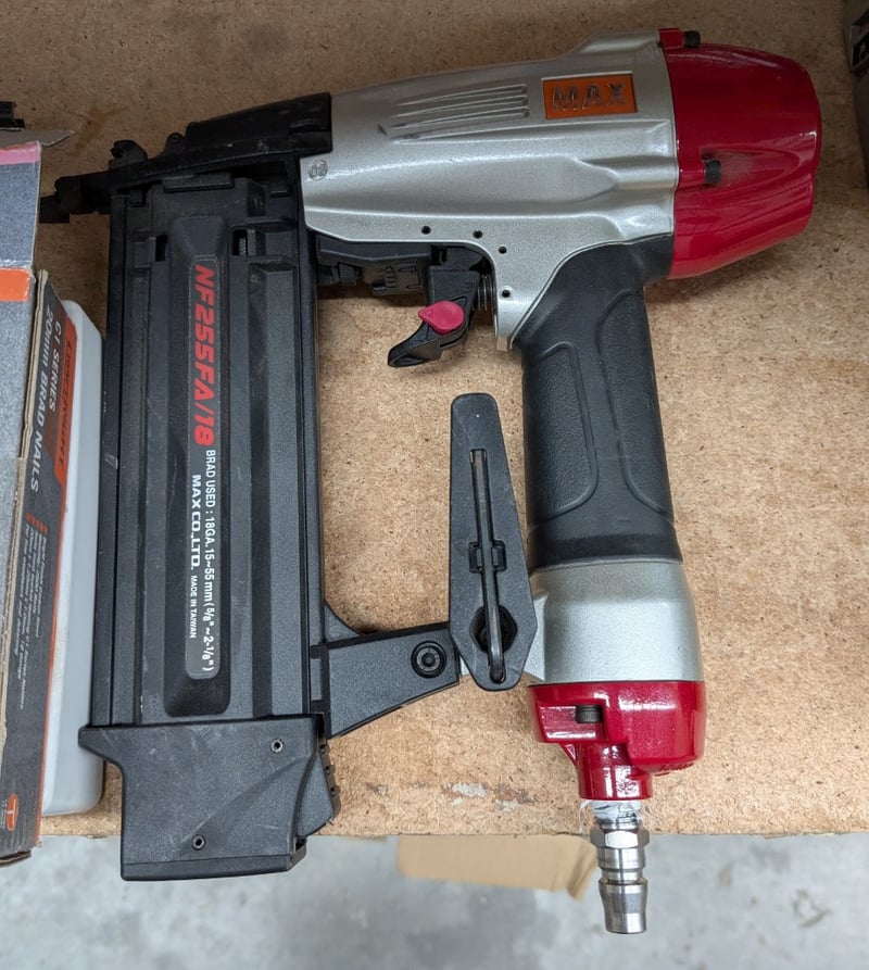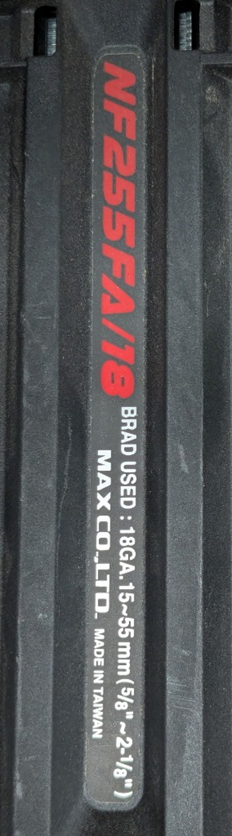 2x Pneumatic brad nailers included Max NF255FA/18 and Project Air, comes with part-boxes of nails Sold as a lot.