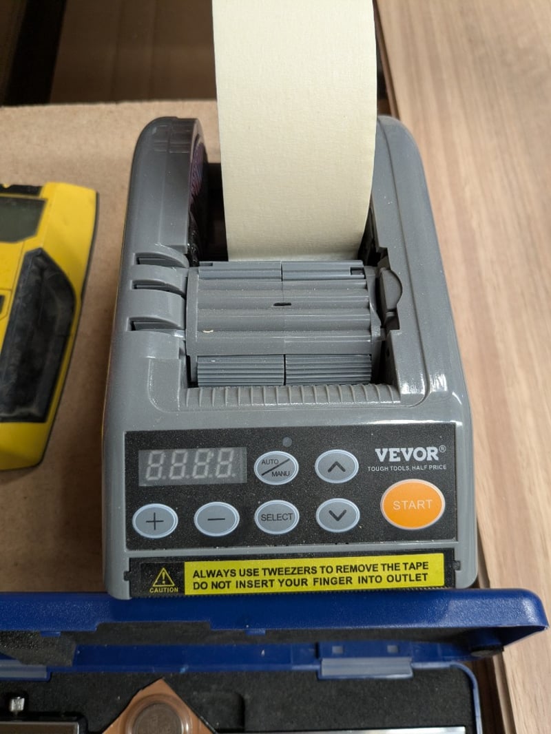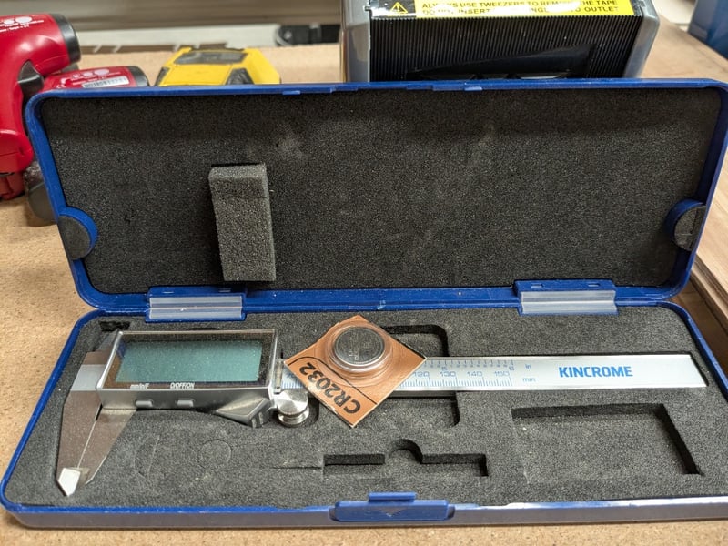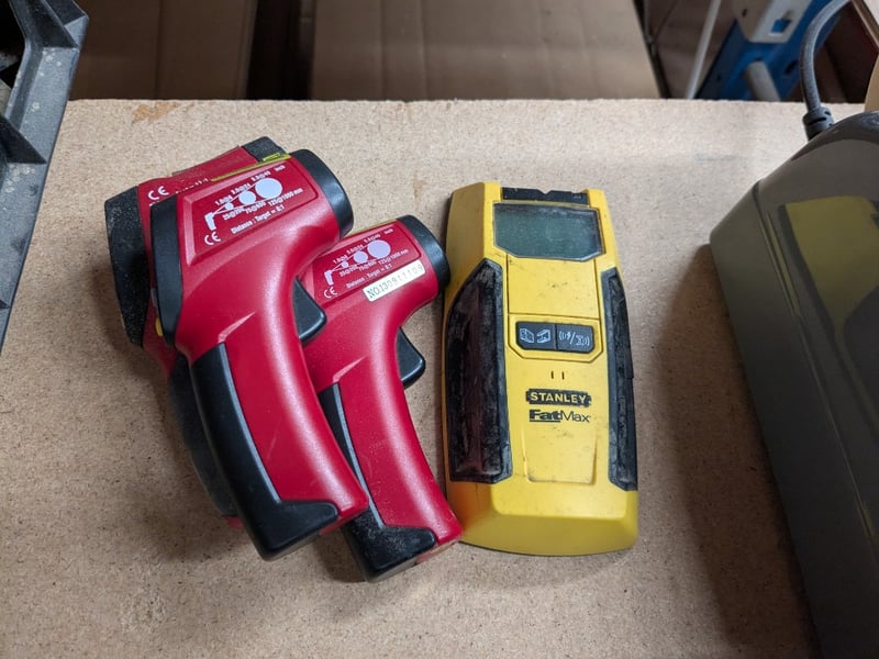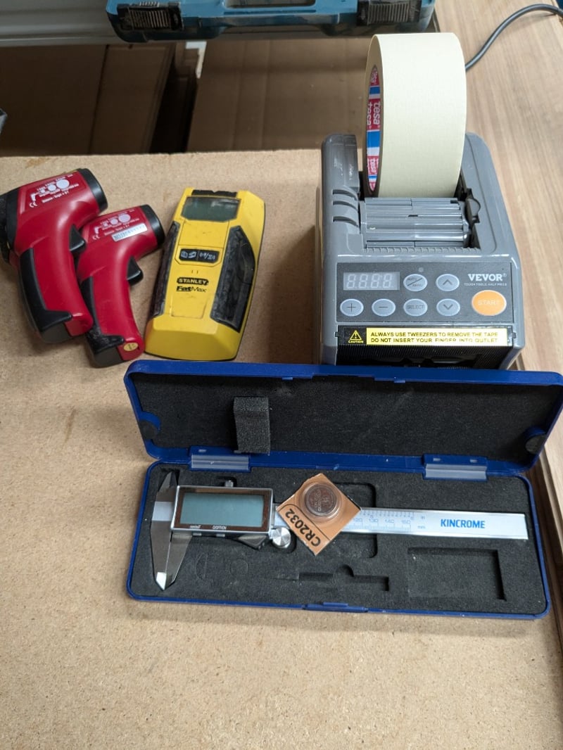 6x assorted items including Kincrome K11105 150mm/6” digital vernier caliper in case, Vevor Z-Cut 9 automatic tape dispenser, Stanley FatMax stud finder and 3x assorted infrared handheld thermometersSold as a lot.