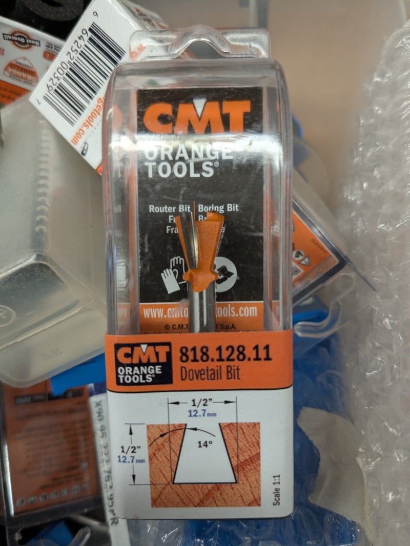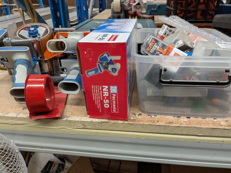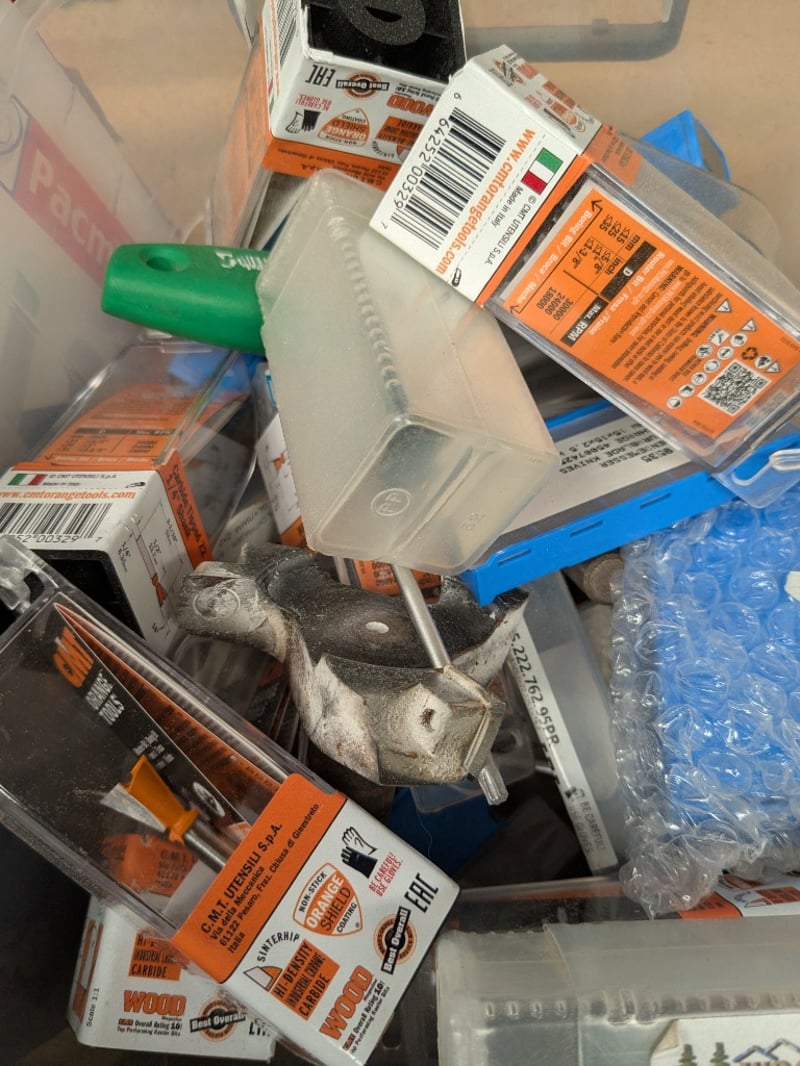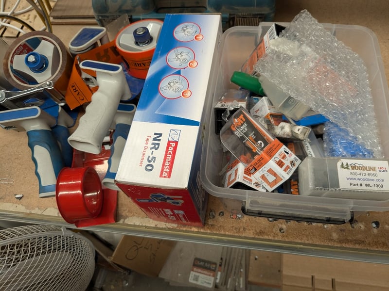 Assorted items including tub of various router bits (most appear new, some used) including many CMT branded bits and 6x assorted tape dispensers Sold as a lot.