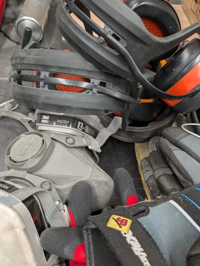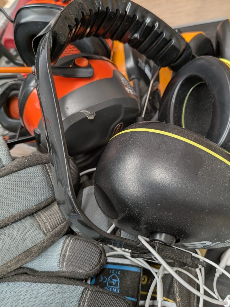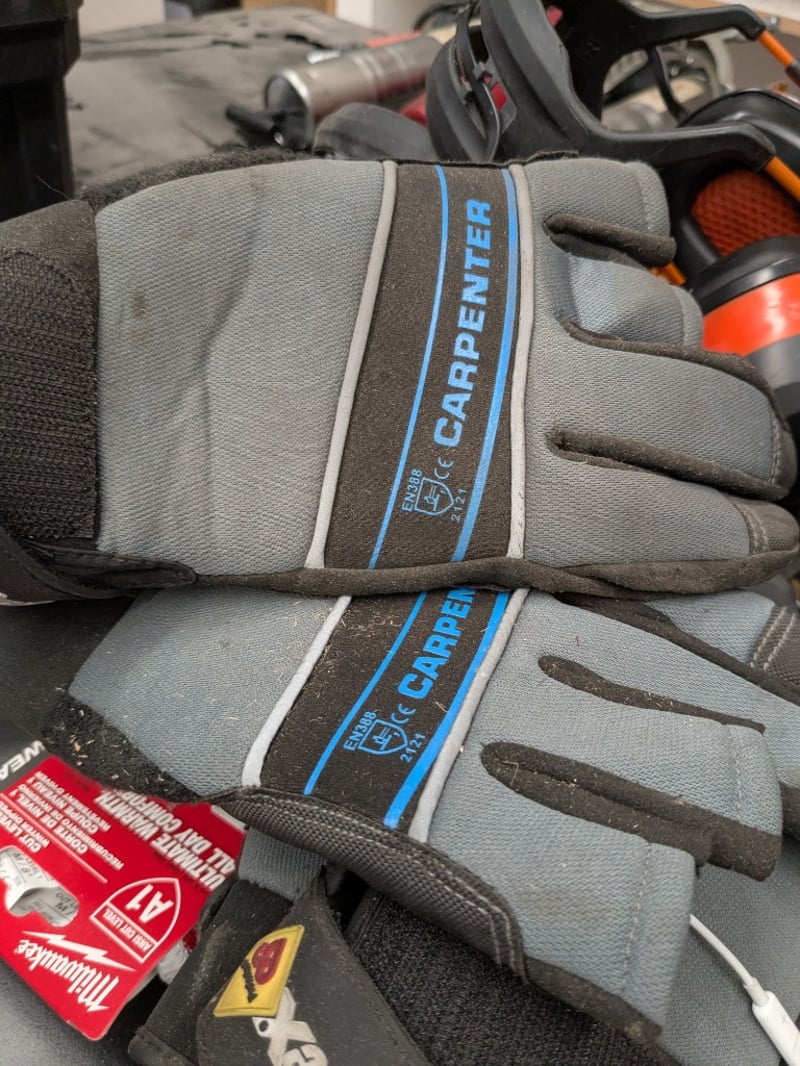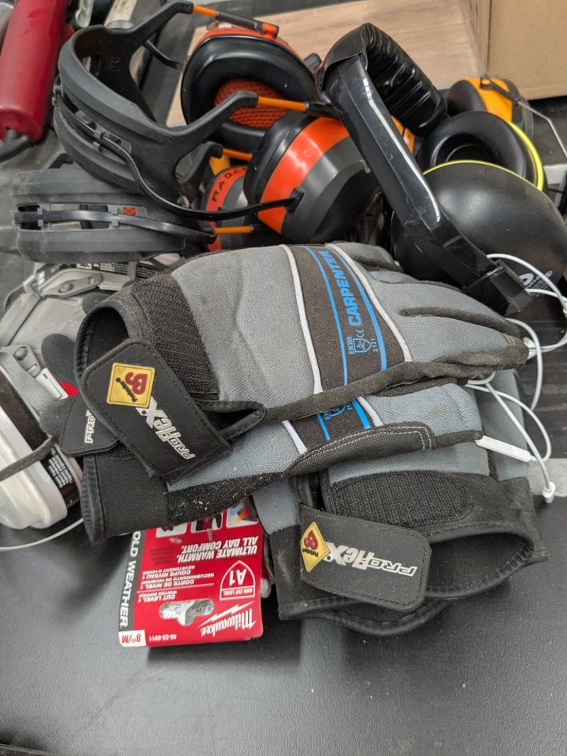 Assorted carpenter gloves and several pairs of ear protection muffs.Note: Signs of wear and tearSold as a lot.