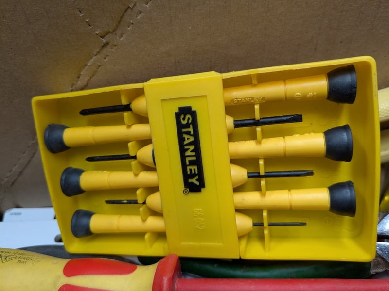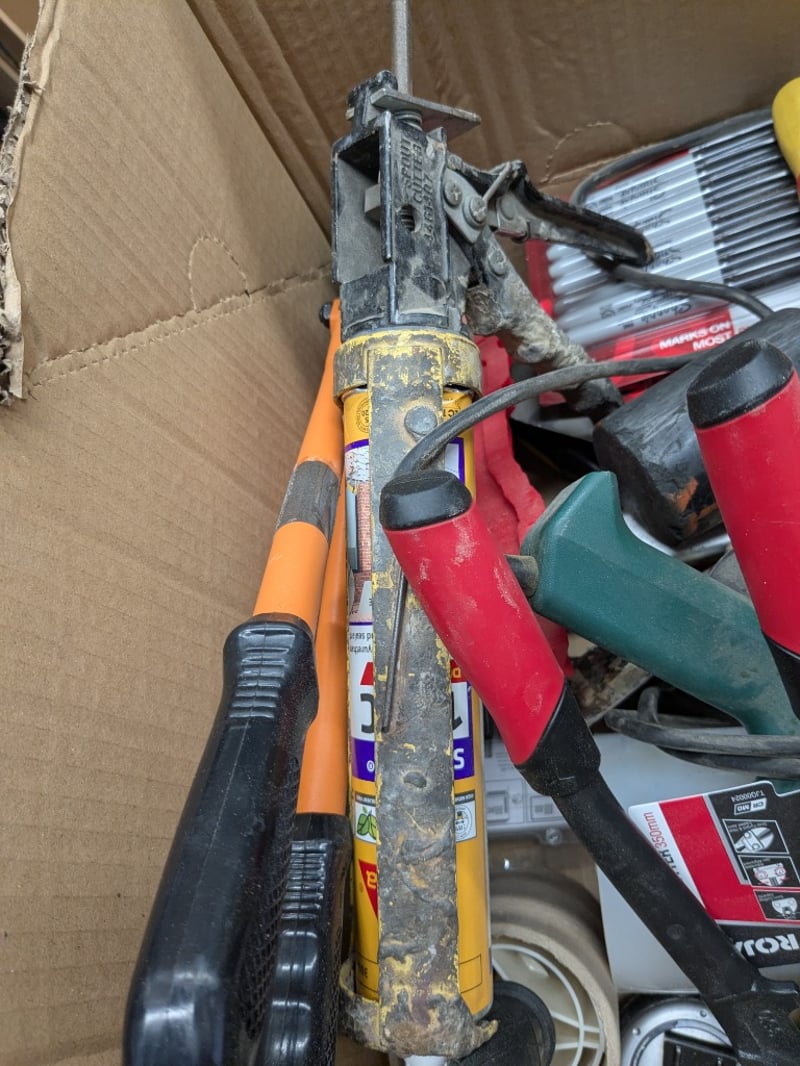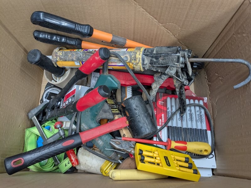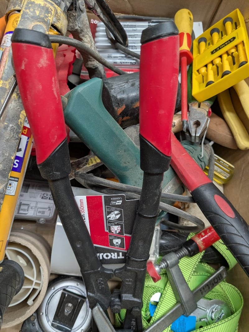Carton of assorted manual hand tools, includes mallet, bolt cutters, screw drivers, clamp, tie-down ratchet strap, markers, caulking gun, tape measure and more Sold as a lot.