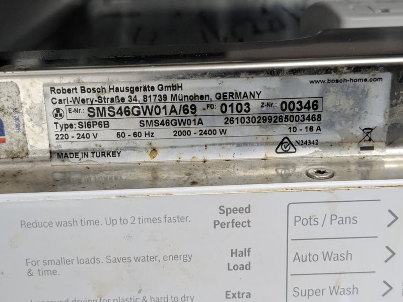Dishwasher - Bosch Serie 4, white, domestic, S/N: 00346. Dimensions (HxWxD): 87 x 60 x 61cm Note: Signs of wear and tear, untested